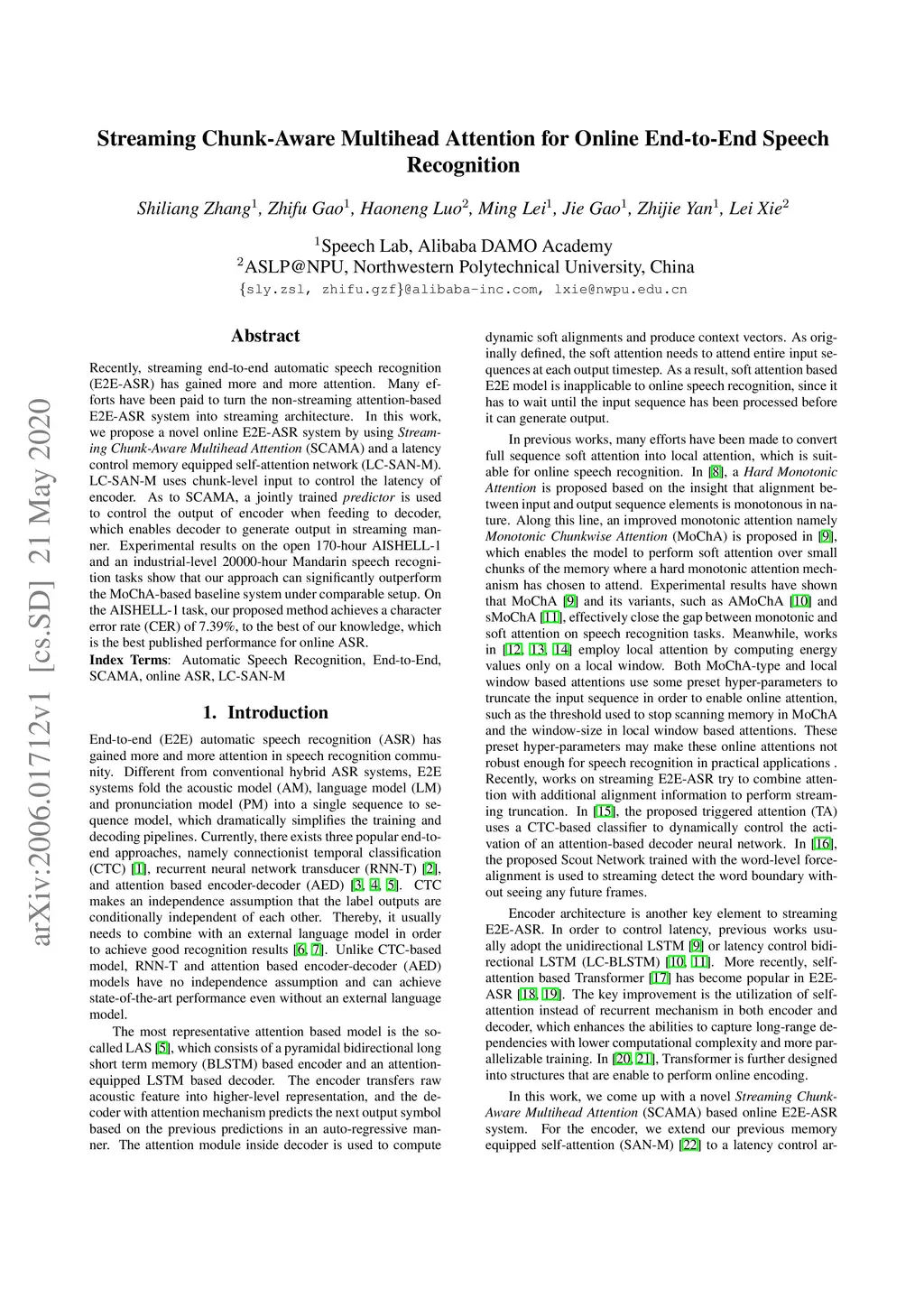 Recently, streaming end-to-end automatic speech recognition (E2E-ASR) has gained more and more attention. Many efforts have been paid to turn the non-streaming attention-based E2E-ASR system into streaming architecture. In this work, we propose a novel online E2E-ASR system by using Streaming Chunk-Aware Multihead Attention(SCAMA) and a latency control memory equipped self-attention network (LC-SAN-M). LC-SAN-M uses chunk-level input to control the latency of encoder. As to SCAMA, a jointly trained predictor is used to control the output of encoder when feeding to decoder, which enables decoder to generate output in streaming manner. Experimental results on the open 170-hour AISHELL-1 and an industrial-level 20000-hour Mandarin speech recognition tasks show that our approach can significantly outperform the MoChA-based baseline system under comparable setup. On the AISHELL-1 task, our proposed method achieves a character error rate (CER) of 7.39%, to the best of our knowledge, which is the best published performance for online ASR.