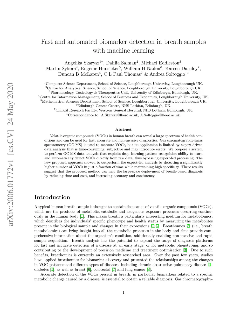 Volatile organic compounds (VOCs) in human breath can reveal a large spectrum of health conditions and can be used for fast, accurate and non-invasive diagnostics. Gas chromatography-mass spectrometry (GC-MS) is used to measure VOCs, but its application is limited by expert-driven data analysis that is time-consuming, subjective and may introduce errors. We propose a system to perform GC-MS data analysis that exploits deep learning pattern recognition ability to learn and automatically detect VOCs directly from raw data, thus bypassing expert-led processing. The new proposed approach showed to outperform the expert-led analysis by detecting a significantly higher number of VOCs in just a fraction of time while maintaining high specificity. These results suggest that the proposed method can help the large-scale deployment of breath-based diagnosis by reducing time and cost, and increasing accuracy and consistency.