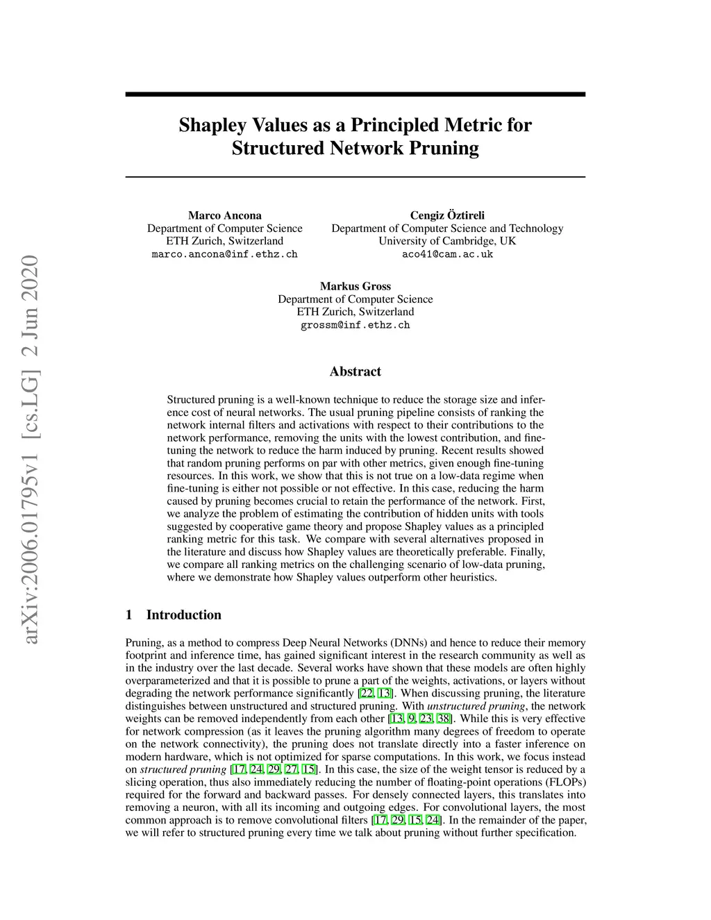 Structured pruning is a well-known technique to reduce the storage size and inference cost of neural networks. The usual pruning pipeline consists of ranking the network internal filters and activations with respect to their contributions to the network performance, removing the units with the lowest contribution, and fine-tuning the network to reduce the harm induced by pruning. Recent results showed that random pruning performs on par with other metrics, given enough fine-tuning resources. In this work, we show that this is not true on a low-data regime when fine-tuning is either not possible or not effective. In this case, reducing the harm caused by pruning becomes crucial to retain the performance of the network. First, we analyze the problem of estimating the contribution of hidden units with tools suggested by cooperative game theory and propose Shapley values as a principled ranking metric for this task. We compare with several alternatives proposed in the literature and discuss how Shapley values are theoretically preferable. Finally, we compare all ranking metrics on the challenging scenario of low-data pruning, where we demonstrate how Shapley values outperform other heuristics.