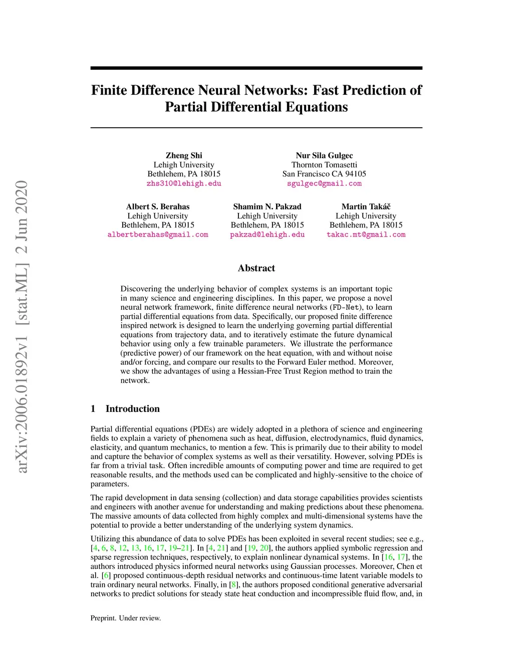 Discovering the underlying behavior of complex systems is an important topic in many science and engineering disciplines. In this paper, we propose a novel neural network framework, finite difference neural networks (FDNet), to learn partial differential equations from data. Specifically, our proposed finite difference inspired network is designed to learn the underlying governing partial differential equations from trajectory data, and to iteratively estimate the future dynamical behavior using only a few trainable parameters. We illustrate the performance (predictive power) of our framework on the heat equation, with and without noise and/or forcing, and compare our results to the Forward Euler method. Moreover, we show the advantages of using a Hessian-Free Trust Region method to train the network.