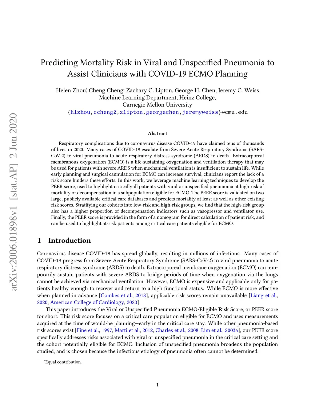 Respiratory complications due to coronavirus disease COVID-19 have claimed tens of thousands of lives in 2020. Many cases of COVID-19 escalate from Severe Acute Respiratory Syndrome (SARS-CoV-2) to viral pneumonia to acute respiratory distress syndrome (ARDS) to death. Extracorporeal membranous oxygenation (ECMO) is a life-sustaining oxygenation and ventilation therapy that may be used for patients with severe ARDS when mechanical ventilation is insufficient to sustain life. While early planning and surgical cannulation for ECMO can increase survival, clinicians report the lack of a risk score hinders these efforts. In this work, we leverage machine learning techniques to develop the PEER score, used to highlight critically ill patients with viral or unspecified pneumonia at high risk of mortality or decompensation in a subpopulation eligible for ECMO. The PEER score is validated on two large, publicly available critical care databases and predicts mortality at least as well as other existing risk scores. Stratifying our cohorts into low-risk and high-risk groups, we find that the high-risk group also has a higher proportion of decompensation indicators such as vasopressor and ventilator use. Finally, the PEER score is provided in the form of a nomogram for direct calculation of patient risk, and can be used to highlight at-risk patients among critical care patients eligible for ECMO.
