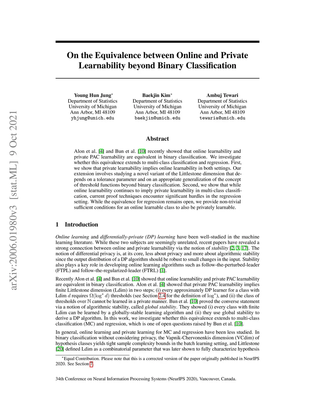 On the Equivalence between Online and Private Learnability beyond Binary