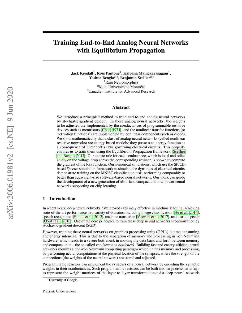 We introduce a principled method to train end-to-end analog neural networks by stochastic gradient descent. In these analog neural networks, the weights to be adjusted are implemented by the conductances of programmable resistive devices such as memristors [Chua, 1971], and the nonlinear transfer functions (or `activation functions') are implemented by nonlinear components such as diodes. We show mathematically that a class of analog neural networks (called nonlinear resistive networks) are energy-based models: they possess an energy function as a consequence of Kirchhoff's laws governing electrical circuits. This property enables us to train them using the Equilibrium Propagation framework [Scellier and Bengio, 2017]. Our update rule for each conductance, which is local and relies solely on the voltage drop across the corresponding resistor, is shown to compute the gradient of the loss function. Our numerical simulations, which use the SPICE-based Spectre simulation framework to simulate the dynamics of electrical circuits, demonstrate training on the MNIST classification task, performing comparably or better than equivalent-size software-based neural networks. Our work can guide the development of a new generation of ultra-fast, compact and low-power neural networks supporting on-chip learning.