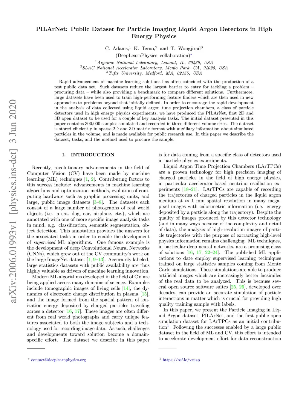 Rapid advancement of machine learning solutions has often coincided with the production of a test public data set. Such datasets reduce the largest barrier to entry for tackling a problem -- procuring data -- while also providing a benchmark to compare different solutions. Furthermore, large datasets have been used to train high-performing feature finders which are then used in new approaches to problems beyond that initially defined. In order to encourage the rapid development in the analysis of data collected using liquid argon time projection chambers, a class of particle detectors used in high energy physics experiments, we have produced the PILArNet, first 2D and 3D open dataset to be used for a couple of key analysis tasks. The initial dataset presented in this paper contains 300,000 samples simulated and recorded in three different volume sizes. The dataset is stored efficiently in sparse 2D and 3D matrix format with auxiliary information about simulated particles in the volume, and is made available for public research use. In this paper we describe the dataset, tasks, and the method used to procure the sample.