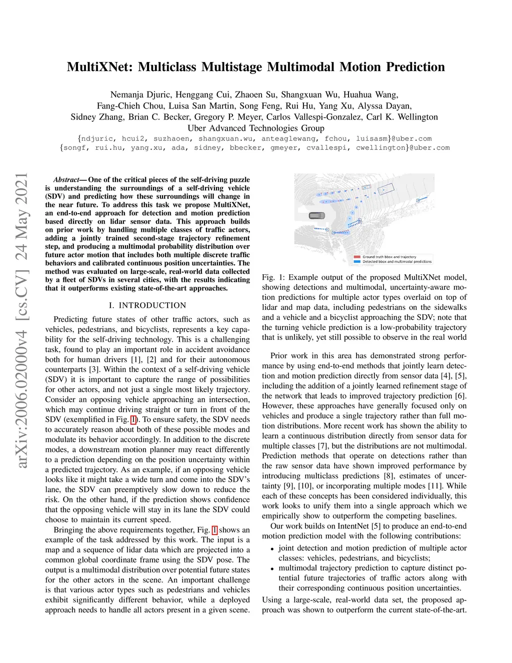 One of the critical pieces of the self-driving puzzle is understanding the surroundings of the self-driving vehicle (SDV) and predicting how these surroundings will change in the near future. To address this task we propose MultiXNet, an end-to-end approach for detection and motion prediction based directly on lidar sensor data. This approach builds on prior work by handling multiple classes of traffic actors, adding a jointly trained second-stage trajectory refinement step, and producing a multimodal probability distribution over future actor motion that includes both multiple discrete traffic behaviors and calibrated continuous uncertainties. The method was evaluated on a large-scale, real-world data set collected by a fleet of SDVs in several cities, with the results indicating that it outperforms existing state-of-the-art approaches.