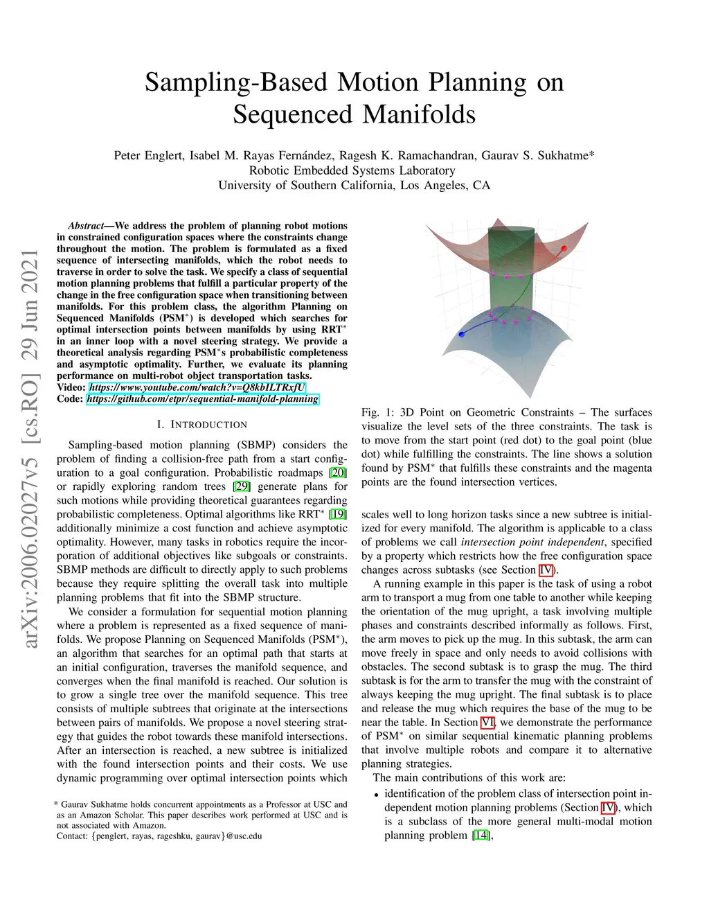 We address the problem of planning robot motions in constrained configuration spaces where the constraints change throughout the motion. A novel problem formulation is introduced that describes a task as a sequence of intersecting manifolds, which the robot needs to traverse in order to solve the task. We specify a class of sequential motion planning problems that fulfill a particular property of the change in the free configuration space when transitioning between manifolds. For this problem class, a sequential motion planning algorithm SMP is developed that searches for optimal intersection points between manifolds by using RRT* in an inner loop with a novel steering strategy. We provide a theoretical analysis regarding its probabilistic completeness and demonstrate its performance on kinematic planning problems where the constraints are represented as geometric primitives. Further, we show its capabilities on solving multi-robot object transportation tasks.