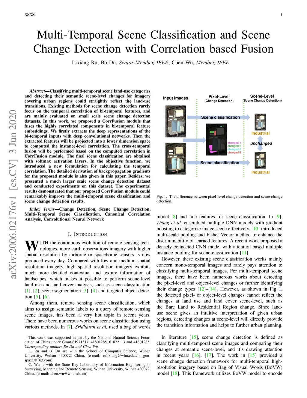 Classifying multi-temporal scene land-use categories and detecting their semantic scene-level changes for imagery covering urban regions could straightly reflect the land-use transitions. Existing methods for scene change detection rarely focus on the temporal correlation of bi-temporal features, and are mainly evaluated on small scale scene change detection datasets. In this work, we proposed a CorrFusion module that fuses the highly correlated components in bi-temporal feature embeddings. We firstly extracts the deep representations of the bi-temporal inputs with deep convolutional networks. Then the extracted features will be projected into a lower dimension space to computed the instance-level correlation. The cross-temporal fusion will be performed based on the computed correlation in CorrFusion module. The final scene classification are obtained with softmax activation layers. In the objective function, we introduced a new formulation for calculating the temporal correlation. The detailed derivation of backpropagation gradients for the proposed module is also given in this paper. Besides, we presented a much larger scale scene change detection dataset and conducted experiments on this dataset. The experimental results demonstrated that our proposed CorrFusion module could remarkably improve the multi-temporal scene classification and scene change detection results.