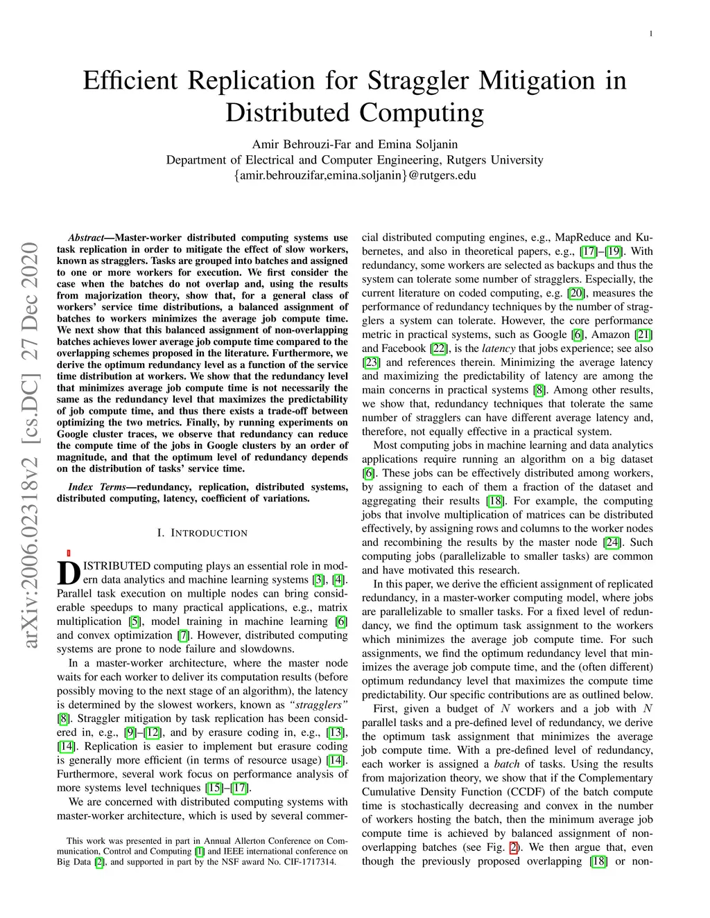Master-worker distributed computing systems use task replication in order to mitigate the effect of slow workers, known as stragglers. Tasks are grouped into batches and assigned to one or more workers for execution. We first consider the case when the batches do not overlap and, using the results from majorization theory, show that, for a general class of workers' service time distributions, a balanced assignment of batches to workers minimizes the average job compute time. We next show that this balanced assignment of non-overlapping batches achieves lower average job compute time compared to the overlapping schemes proposed in the literature. Furthermore, we derive the optimum redundancy level as a function of the service time distribution at workers. We show that the redundancy level that minimizes average job compute time is not necessarily the same as the redundancy level that maximizes the predictability of job compute time, and thus there exists a trade-off between optimizing the two metrics. Finally, by running experiments on Google cluster traces, we observe that redundancy can reduce the compute time of the jobs in Google clusters by an order of magnitude, and that the optimum level of redundancy depends on the distribution of tasks' service time.