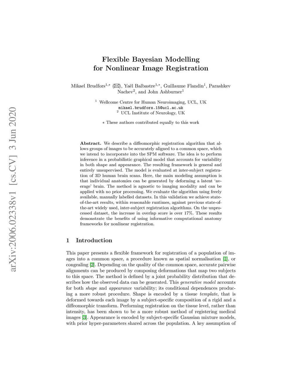 We describe a diffeomorphic registration algorithm that allows groups of images to be accurately aligned to a common space, which we intend to incorporate into the SPM software. The idea is to perform inference in a probabilistic graphical model that accounts for variability in both shape and appearance. The resulting framework is general and entirely unsupervised. The model is evaluated at inter-subject registration of 3D human brain scans. Here, the main modeling assumption is that individual anatomies can be generated by deforming a latent áverage' brain. The method is agnostic to imaging modality and can be applied with no prior processing. We evaluate the algorithm using freely available, manually labelled datasets. In this validation we achieve state-of-the-art results, within reasonable runtimes, against previous state-of-the-art widely used, inter-subject registration algorithms. On the unprocessed dataset, the increase in overlap score is over 17%. These results demonstrate the benefits of using informative computational anatomy frameworks for nonlinear registration.
