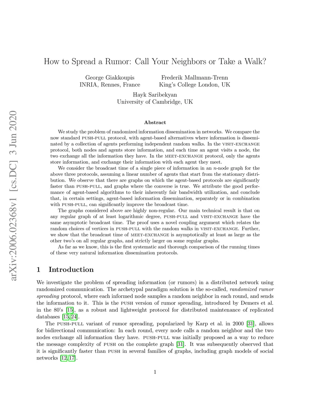 How to Spread a Rumor: Call Your Neighbors or Take a Walk?