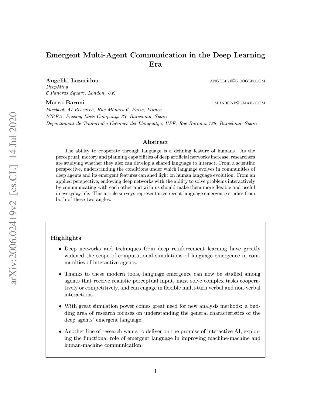 Emergent Multi-Agent Communication in the Deep Learning Era