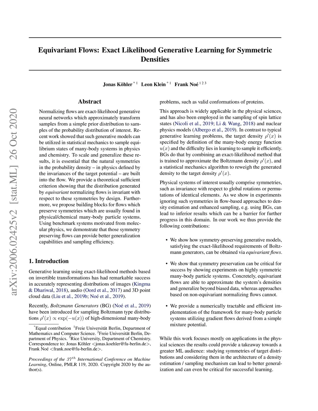 Normalizing flows are exact-likelihood generative neural networks which approximately transform samples from a simple prior distribution to samples of the probability distribution of interest. Recent work showed that such generative models can be utilized in statistical mechanics to sample equilibrium states of many-body systems in physics and chemistry. To scale and generalize these results, it is essential that the natural symmetries in the probability density -- in physics defined by the invariances of the target potential -- are built into the flow. We provide a theoretical sufficient criterion showing that the distribution generated by \textit{equivariant} normalizing flows is invariant with respect to these symmetries by design. Furthermore, we propose building blocks for flows which preserve symmetries which are usually found in physical/chemical many-body particle systems. Using benchmark systems motivated from molecular physics, we demonstrate that those symmetry preserving flows can provide better generalization capabilities and sampling efficiency.