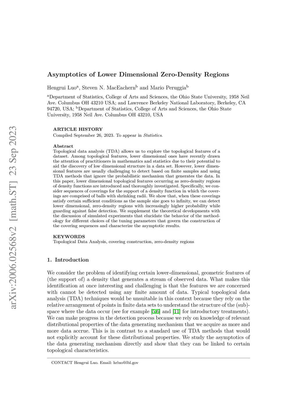 Topological data analysis (TDA) allows us to explore the topological features of a dataset. Among topological features, lower dimensional ones have recently drawn the attention of practitioners in mathematics and statistics due to their potential to aid the discovery of low dimensional structure in a data set. However, lower dimensional features are usually challenging to detect based on finite samples and using TDA methods that ignore the probabilistic mechanism that generates the data. In this paper, lower dimensional topological features occurring as zero-density regions of density functions are introduced and thoroughly investigated. Specifically, we consider sequences of coverings for the support of a density function in which the coverings are comprised of balls with shrinking radii. We show that, when these coverings satisfy certain sufficient conditions as the sample size goes to infinity, we can detect lower dimensional, zero-density regions with increasingly higher probability while guarding against false detection. We supplement the theoretical developments with the discussion of simulated experiments that elucidate the behavior of the methodology for different choices of the tuning parameters that govern the construction of the covering sequences and characterize the asymptotic results.