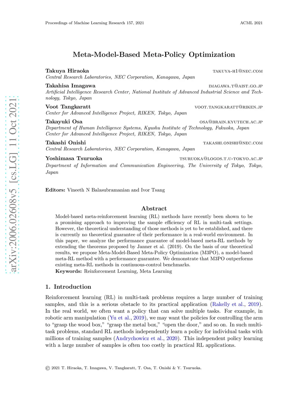 Model-based meta-reinforcement learning (RL) methods have recently been shown to be a promising approach to improving the sample efficiency of RL in multi-task settings. However, the theoretical understanding of those methods is yet to be established, and there is currently no theoretical guarantee of their performance in a real-world environment. In this paper, we analyze the performance guarantee of model-based meta-RL methods by extending the theorems proposed by Janner et al. (2019). On the basis of our theoretical results, we propose Meta-Model-Based Meta-Policy Optimization (M3PO), a model-based meta-RL method with a performance guarantee. We demonstrate that M3PO outperforms existing meta-RL methods in continuous-control benchmarks.