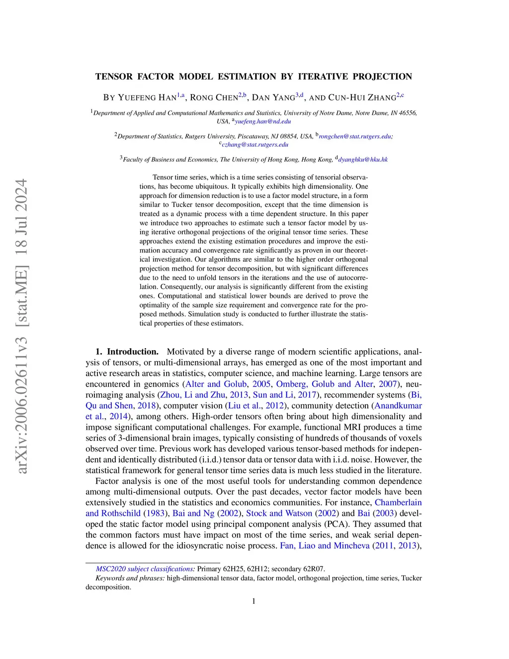 Tensor time series, which is a time series consisting of tensorial observations, has become ubiquitous. It typically exhibits high dimensionality. One approach for dimension reduction is to use a factor model structure, in a form similar to Tucker tensor decomposition, except that the time dimension is treated as a dynamic process with a time dependent structure. In this paper we introduce two approaches to estimate such a tensor factor model by using iterative orthogonal projections of the original tensor time series. These approaches extend the existing estimation procedures and improve the estimation accuracy and convergence rate significantly as proven in our theoretical investigation. Our algorithms are similar to the higher order orthogonal projection method for tensor decomposition, but with significant differences due to the need to unfold tensors in the iterations and the use of autocorrelation. Consequently, our analysis is significantly different from the existing ones. Computational and statistical lower bounds are derived to prove the optimality of the sample size requirement and convergence rate for the proposed methods. Simulation study is conducted to further illustrate the statistical properties of these estimators.