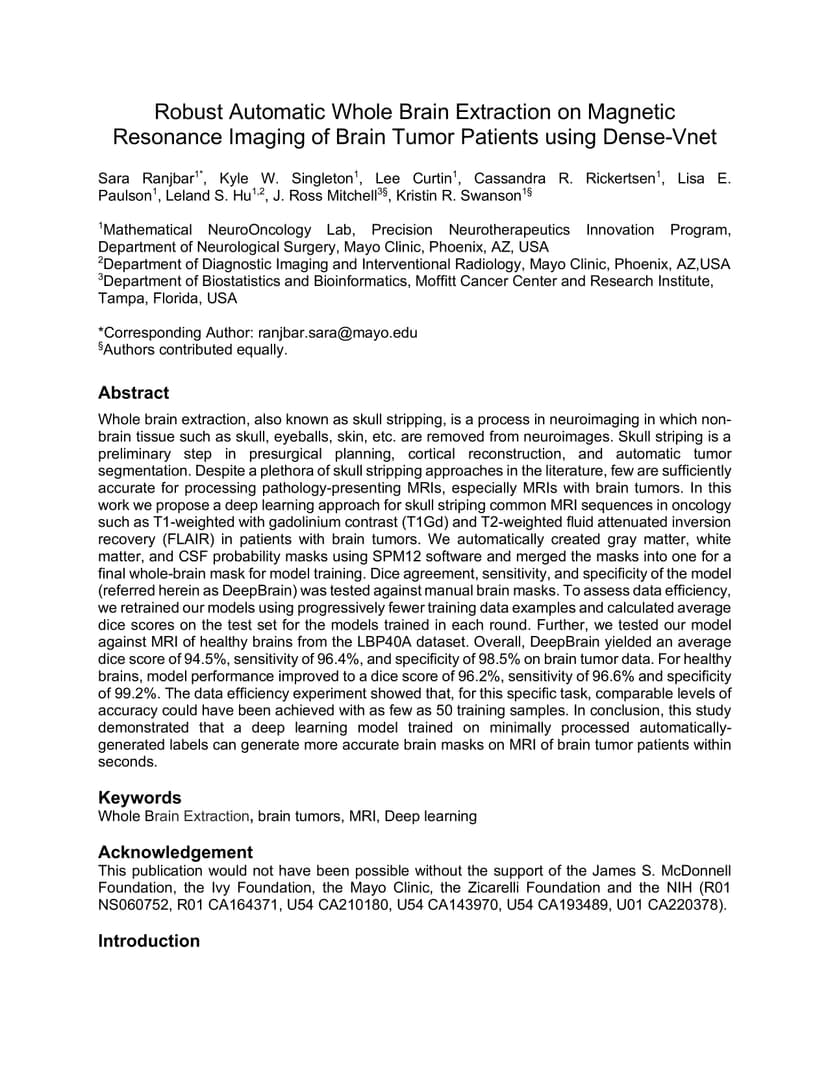 Whole brain extraction, also known as skull stripping, is a process in neuroimaging in which non-brain tissue such as skull, eyeballs, skin, etc. are removed from neuroimages. Skull striping is a preliminary step in presurgical planning, cortical reconstruction, and automatic tumor segmentation. Despite a plethora of skull stripping approaches in the literature, few are sufficiently accurate for processing pathology-presenting MRIs, especially MRIs with brain tumors. In this work we propose a deep learning approach for skull striping common MRI sequences in oncology such as T1-weighted with gadolinium contrast (T1Gd) and T2-weighted fluid attenuated inversion recovery (FLAIR) in patients with brain tumors. We automatically created gray matter, white matter, and CSF probability masks using SPM12 software and merged the masks into one for a final whole-brain mask for model training. Dice agreement, sensitivity, and specificity of the model (referred herein as DeepBrain) was tested against manual brain masks. To assess data efficiency, we retrained our models using progressively fewer training data examples and calculated average dice scores on the test set for the models trained in each round. Further, we tested our model against MRI of healthy brains from the LBP40A dataset. Overall, DeepBrain yielded an average dice score of 94.5%, sensitivity of 96.4%, and specificity of 98.5% on brain tumor data. For healthy brains, model performance improved to a dice score of 96.2%, sensitivity of 96.6% and specificity of 99.2%. The data efficiency experiment showed that, for this specific task, comparable levels of accuracy could have been achieved with as few as 50 training samples. In conclusion, this study demonstrated that a deep learning model trained on minimally processed automatically-generated labels can generate more accurate brain masks on MRI of brain tumor patients within seconds.
