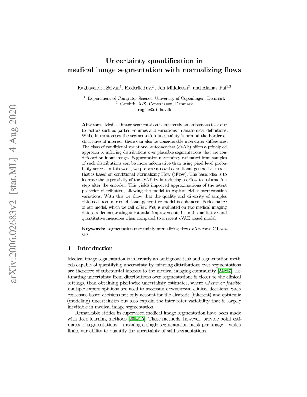 Medical image segmentation is inherently an ambiguous task due to factors such as partial volumes and variations in anatomical definitions. While in most cases the segmentation uncertainty is around the border of structures of interest, there can also be considerable inter-rater differences. The class of conditional variational autoencoders (cVAE) offers a principled approach to inferring distributions over plausible segmentations that are conditioned on input images. Segmentation uncertainty estimated from samples of such distributions can be more informative than using pixel level probability scores. In this work, we propose a novel conditional generative model that is based on conditional Normalizing Flow (cFlow). The basic idea is to increase the expressivity of the cVAE by introducing a cFlow transformation step after the encoder. This yields improved approximations of the latent posterior distribution, allowing the model to capture richer segmentation variations. With this we show that the quality and diversity of samples obtained from our conditional generative model is enhanced. Performance of our model, which we call cFlow Net, is evaluated on two medical imaging datasets demonstrating substantial improvements in both qualitative and quantitative measures when compared to a recent cVAE based model.