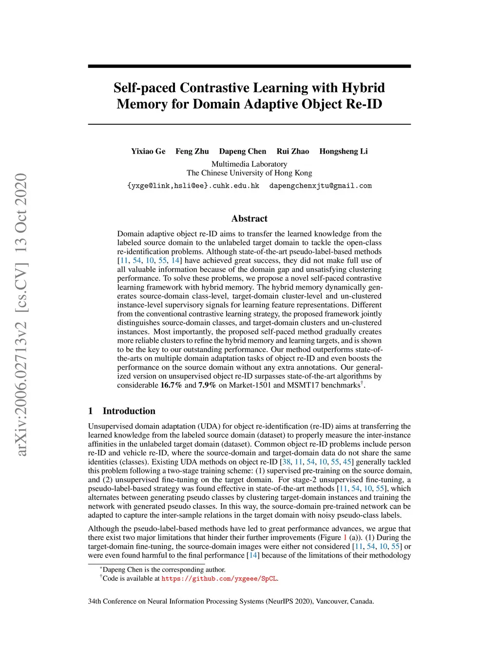 Self-paced Contrastive Learning with Hybrid Memory for Domain Adaptive