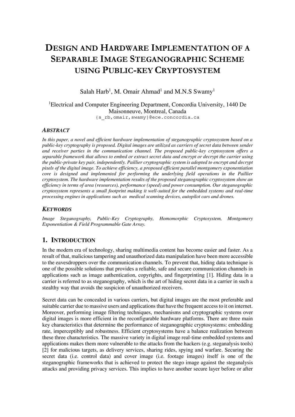 In this paper, a novel and efficient hardware implementation of steganographic cryptosystem based on a public-key cryptography is proposed. Digital images are utilized as carriers of secret data between sender and receiver parties in the communication channel. The proposed public-key cryptosystem offers a separable framework that allows to embed or extract secret data and encrypt or decrypt the carrier using the public-private key pair, independently. Paillier cryptographic system is adopted to encrypt and decrypt pixels of the digital image. To achieve efficiency, a proposed efficient parallel montgomery exponentiation core is designed and implemented for performing the underlying field operations in the Paillier cryptosystem. The hardware implementation results of the proposed steganographic cryptosystem show an efficiency in terms of area (resources), performance (speed) and power consumption. Our steganographic cryptosystem represents a small footprint making it well-suited for the embedded systems and real-time processing engines in applications such as medical scanning devices, autopilot cars and drones.