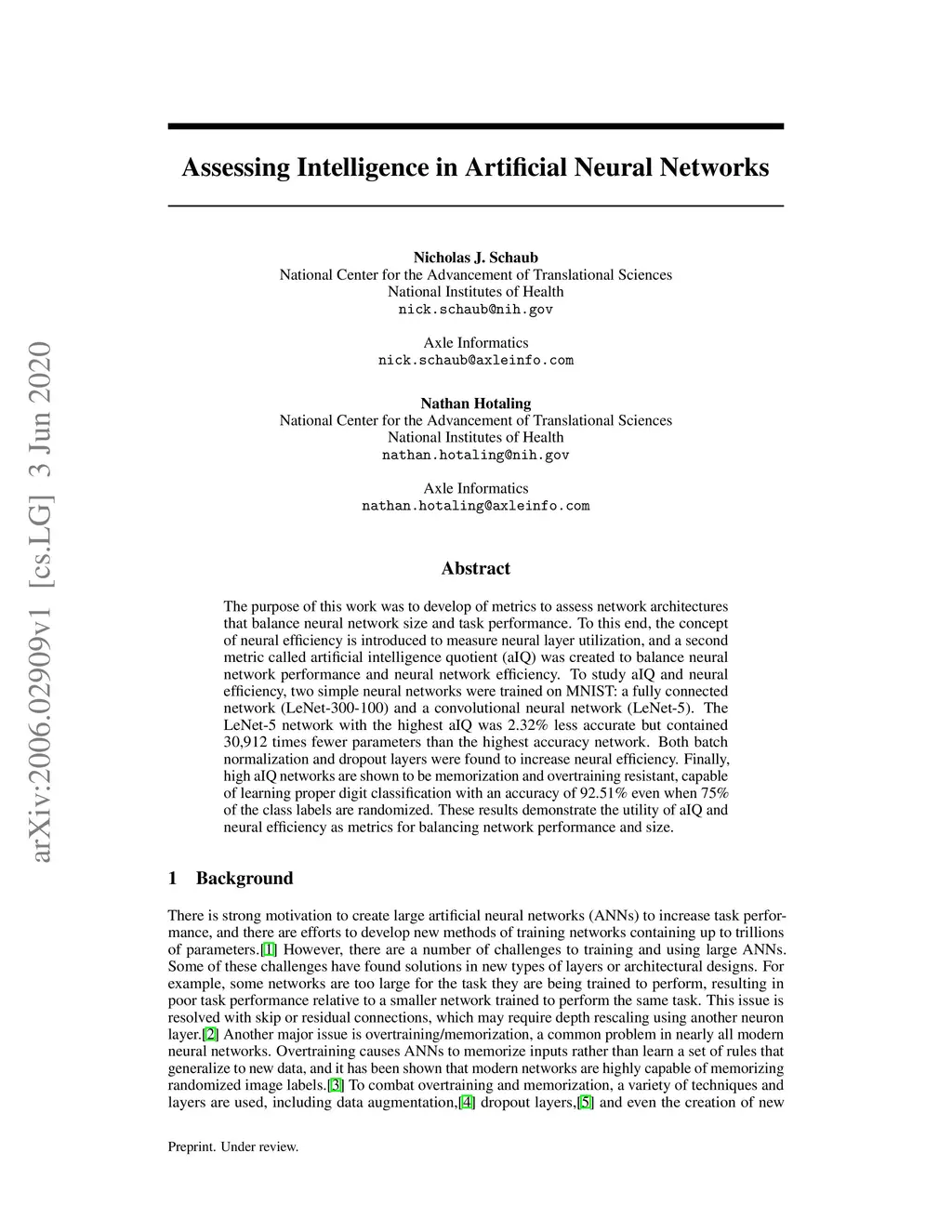 The purpose of this work was to develop of metrics to assess network architectures that balance neural network size and task performance. To this end, the concept of neural efficiency is introduced to measure neural layer utilization, and a second metric called artificial intelligence quotient (aIQ) was created to balance neural network performance and neural network efficiency. To study aIQ and neural efficiency, two simple neural networks were trained on MNIST: a fully connected network (LeNet-300-100) and a convolutional neural network (LeNet-5). The LeNet-5 network with the highest aIQ was 2.32% less accurate but contained 30,912 times fewer parameters than the highest accuracy network. Both batch normalization and dropout layers were found to increase neural efficiency. Finally, high aIQ networks are shown to be memorization and overtraining resistant, capable of learning proper digit classification with an accuracy of 92.51% even when 75% of the class labels are randomized. These results demonstrate the utility of aIQ and neural efficiency as metrics for balancing network performance and size.