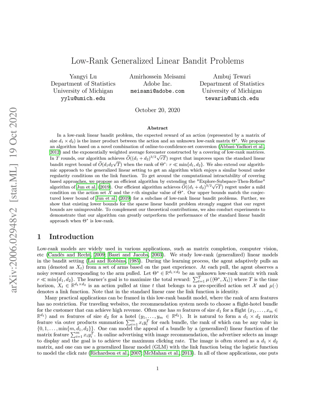 In a low-rank linear bandit problem, the reward of an action (represented by a matrix of size ) is the inner product between the action and an unknown low-rank matrix . We propose an algorithm based on a novel combination of online-to-confidence-set conversion~\citep{abbasi2012online} and the exponentially weighted average forecaster constructed by a covering of low-rank matrices. In rounds, our algorithm achieves regret that improves upon the standard linear bandit regret bound of when the rank of : . We also extend our algorithmic approach to the generalized linear setting to get an algorithm which enjoys a similar bound under regularity conditions on the link function. To get around the computational intractability of covering based approaches, we propose an efficient algorithm by extending the "Explore-Subspace-Then-Refine" algorithm of~\citet{jun2019bilinear}. Our efficient algorithm achieves regret under a mild condition on the action set and the -th singular value of . Our upper bounds match the conjectured lower bound of \cite{jun2019bilinear} for a subclass of low-rank linear bandit problems. Further, we show that existing lower bounds for the sparse linear bandit problem strongly suggest that our regret bounds are unimprovable. To complement our theoretical contributions, we also conduct experiments to demonstrate that our algorithm can greatly outperform the performance of the standard linear bandit approach when is low-rank.
