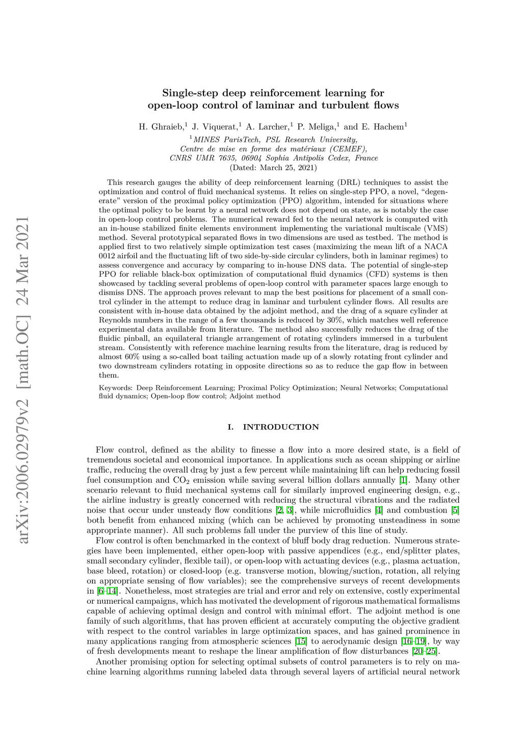 This research gauges the ability of deep reinforcement learning (DRL) techniques to assist the optimization and control of fluid mechanical systems. It combines a novel, "degenerate" version of the proximal policy optimization (PPO) algorithm, that trains a neural network in optimizing the system only once per learning episode, and an in-house stabilized finite elements environment implementing the variational multiscale (VMS) method, that computes the numerical reward fed to the neural network. Three prototypical examples of separated flows in two dimensions are used as testbed for developing the methodology, each of which adds a layer of complexity due either to the unsteadiness of the flow solutions, or the sharpness of the objective function, or the dimension of the control parameter space. Relevance is carefully assessed by comparing systematically to reference data obtained by canonical direct and adjoint methods. Beyond adding value to the shallow literature on this subject, these findings establish the potential of single-step PPO for reliable black-box optimization of computational fluid dynamics (CFD) systems, which paves the way for future progress in optimal flow control using this new class of methods.