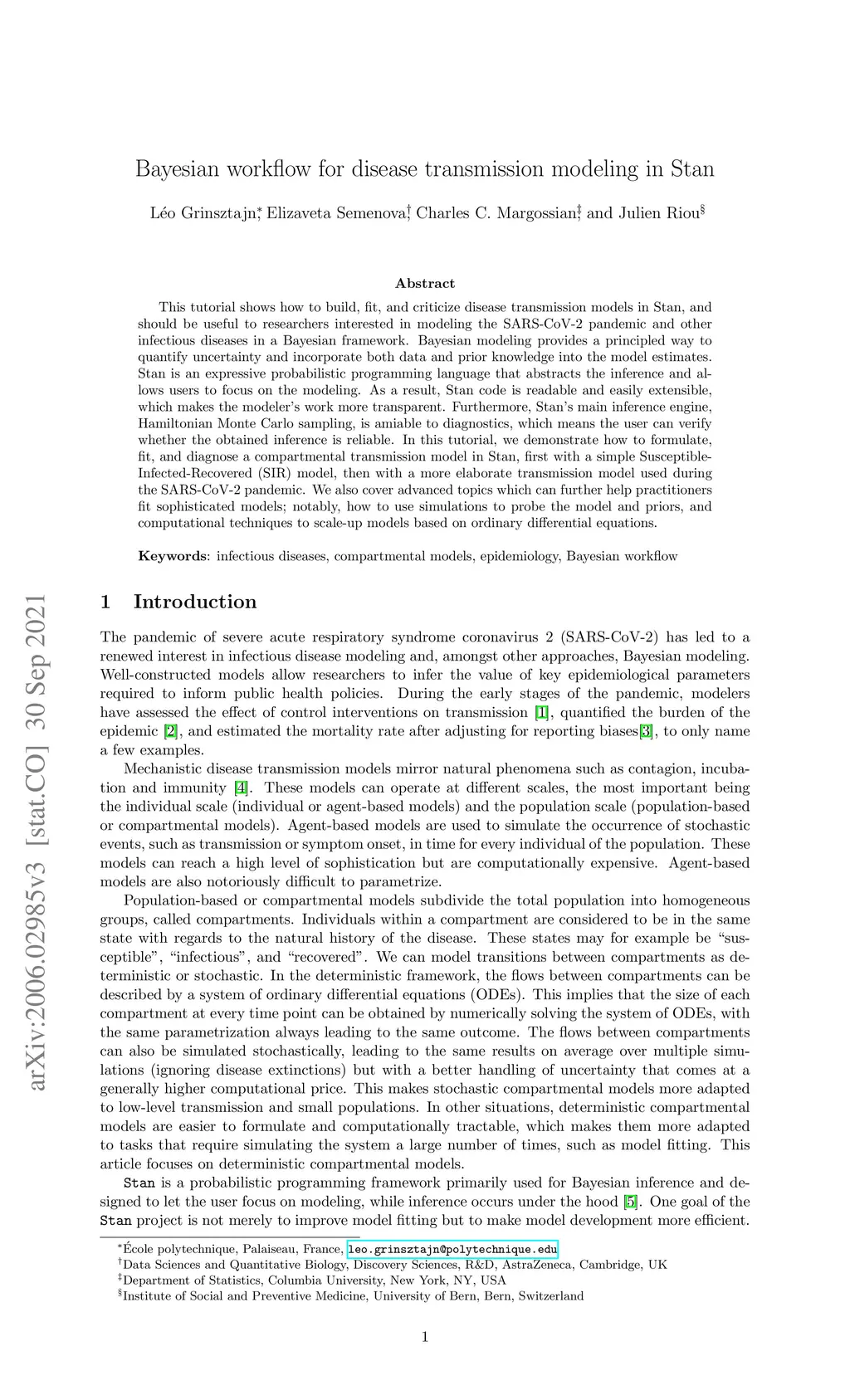 This tutorial shows how to build, fit, and criticize disease transmission models in Stan, and should be useful to researchers interested in modeling the SARS-CoV-2 pandemic and other infectious diseases in a Bayesian framework. Bayesian modeling provides a principled way to quantify uncertainty and incorporate both data and prior knowledge into the model estimates. Stan is an expressive probabilistic programming language that abstracts the inference and allows users to focus on the modeling. As a result, Stan code is readable and easily extensible, which makes the modeler's work more transparent. Furthermore, Stan's main inference engine, Hamiltonian Monte Carlo sampling, is amiable to diagnostics, which means the user can verify whether the obtained inference is reliable. In this tutorial, we demonstrate how to formulate, fit, and diagnose a compartmental transmission model in Stan, first with a simple Susceptible-Infected-Recovered (SIR) model, then with a more elaborate transmission model used during the SARS-CoV-2 pandemic. We also cover advanced topics which can further help practitioners fit sophisticated models; notably, how to use simulations to probe the model and priors, and computational techniques to scale-up models based on ordinary differential equations.