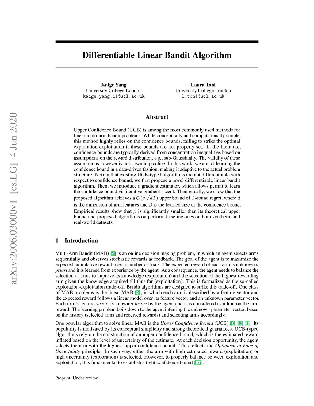 Upper Confidence Bound (UCB) is arguably the most commonly used method for linear multi-arm bandit problems. While conceptually and computationally simple, this method highly relies on the confidence bounds, failing to strike the optimal exploration-exploitation if these bounds are not properly set. In the literature, confidence bounds are typically derived from concentration inequalities based on assumptions on the reward distribution, e.g., sub-Gaussianity. The validity of these assumptions however is unknown in practice. In this work, we aim at learning the confidence bound in a data-driven fashion, making it adaptive to the actual problem structure. Specifically, noting that existing UCB-typed algorithms are not differentiable with respect to confidence bound, we first propose a novel differentiable linear bandit algorithm. Then, we introduce a gradient estimator, which allows the confidence bound to be learned via gradient ascent. Theoretically, we show that the proposed algorithm achieves a upper bound of -round regret, where is the dimension of arm features and is the learned size of confidence bound. Empirical results show that is significantly smaller than its theoretical upper bound and proposed algorithms outperforms baseline ones on both simulated and real-world datasets.