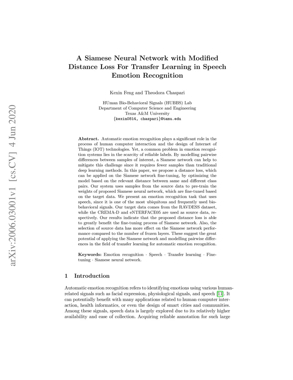Automatic emotion recognition plays a significant role in the process of human computer interaction and the design of Internet of Things (IOT) technologies. Yet, a common problem in emotion recognition systems lies in the scarcity of reliable labels. By modeling pairwise differences between samples of interest, a Siamese network can help to mitigate this challenge since it requires fewer samples than traditional deep learning methods. In this paper, we propose a distance loss, which can be applied on the Siamese network fine-tuning, by optimizing the model based on the relevant distance between same and difference class pairs. Our system use samples from the source data to pre-train the weights of proposed Siamese neural network, which are fine-tuned based on the target data. We present an emotion recognition task that uses speech, since it is one of the most ubiquitous and frequently used bio-behavioral signals. Our target data comes from the RAVDESS dataset, while the CREMA-D and eNTERFACE'05 are used as source data, respectively. Our results indicate that the proposed distance loss is able to greatly benefit the fine-tuning process of Siamese network. Also, the selection of source data has more effect on the Siamese network performance compared to the number of frozen layers. These suggest the great potential of applying the Siamese network and modelling pairwise differences in the field of transfer learning for automatic emotion recognition.
