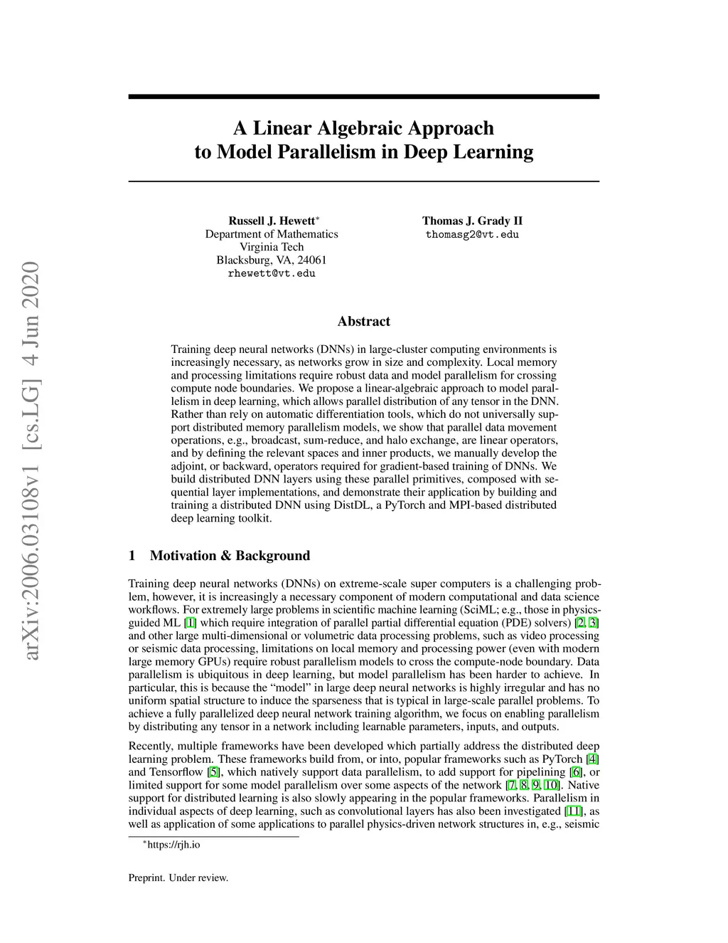 A Linear Algebraic Approach to Model Parallelism in Deep Learning