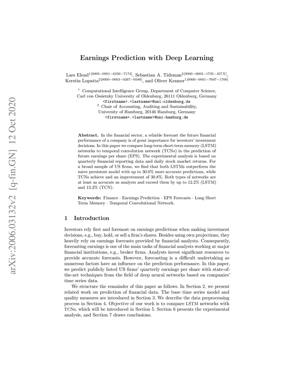 In the financial sector, a reliable forecast the future financial performance of a company is of great importance for investors' investment decisions. In this paper we compare long-term short-term memory (LSTM) networks to temporal convolution network (TCNs) in the prediction of future earnings per share (EPS). The experimental analysis is based on quarterly financial reporting data and daily stock market returns. For a broad sample of US firms, we find that both LSTMs outperform the naive persistent model with up to 30.0% more accurate predictions, while TCNs achieve and an improvement of 30.8%. Both types of networks are at least as accurate as analysts and exceed them by up to 12.2% (LSTM) and 13.2% (TCN).