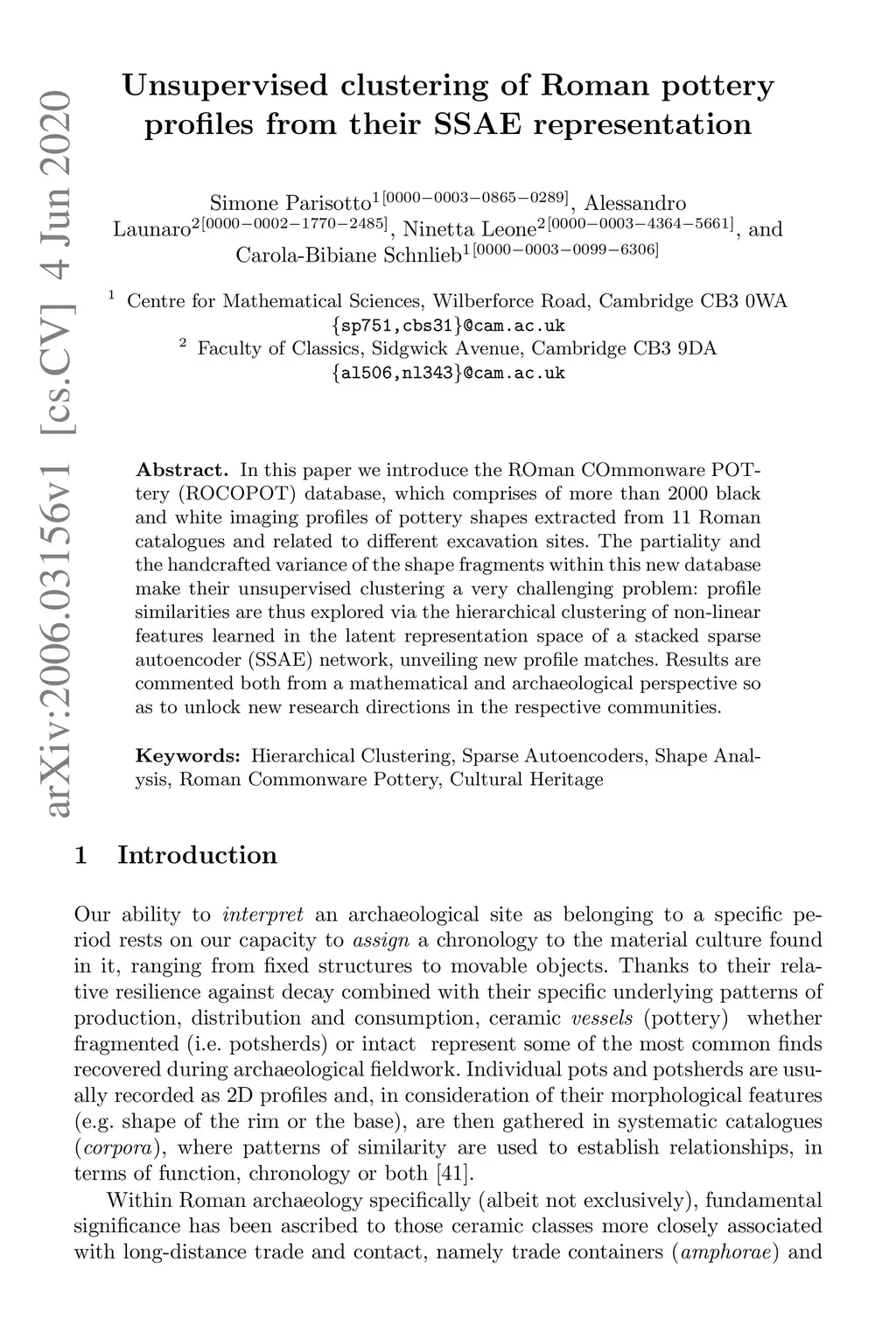 In this paper we introduce the ROman COmmonware POTtery (ROCOPOT) database, which comprises of more than 2000 black and white imaging profiles of pottery shapes extracted from 11 Roman catalogues and related to different excavation sites. The partiality and the handcrafted variance of the shape fragments within this new database make their unsupervised clustering a very challenging problem: profile similarities are thus explored via the hierarchical clustering of non-linear features learned in the latent representation space of a stacked sparse autoencoder (SSAE) network, unveiling new profile matches. Results are commented both from a mathematical and archaeological perspective so as to unlock new research directions in the respective communities.
