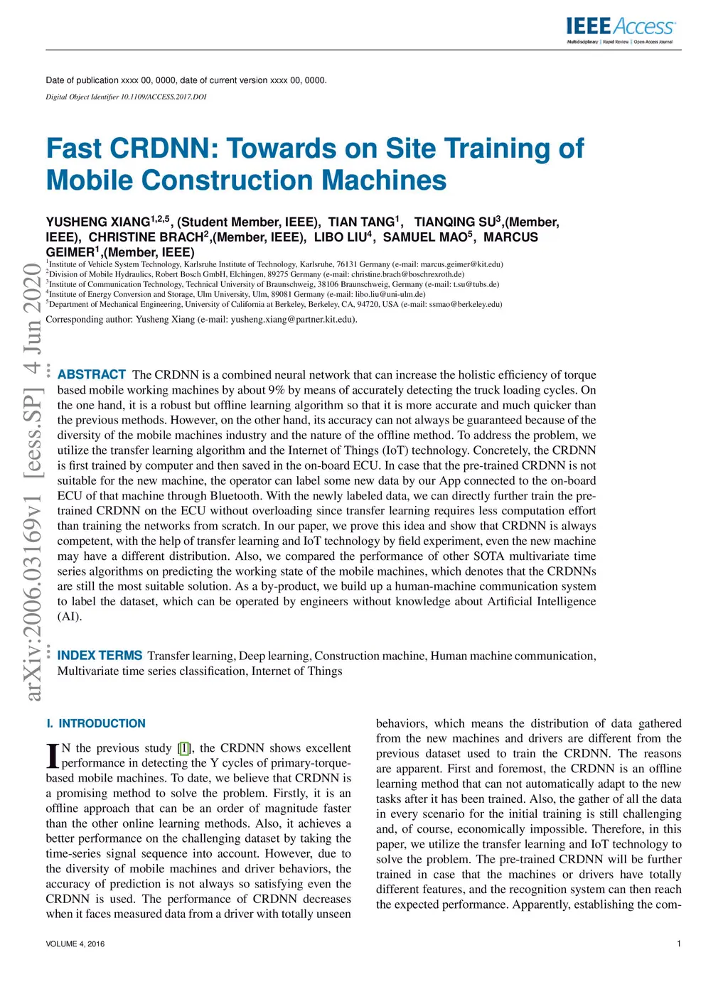 The CRDNN is a combined neural network that can increase the holistic efficiency of torque based mobile working machines by about 9% by means of accurately detecting the truck loading cycles. On the one hand, it is a robust but offline learning algorithm so that it is more accurate and much quicker than the previous methods. However, on the other hand, its accuracy can not always be guaranteed because of the diversity of the mobile machines industry and the nature of the offline method. To address the problem, we utilize the transfer learning algorithm and the Internet of Things (IoT) technology. Concretely, the CRDNN is first trained by computer and then saved in the on-board ECU. In case that the pre-trained CRDNN is not suitable for the new machine, the operator can label some new data by our App connected to the on-board ECU of that machine through Bluetooth. With the newly labeled data, we can directly further train the pretrained CRDNN on the ECU without overloading since transfer learning requires less computation effort than training the networks from scratch. In our paper, we prove this idea and show that CRDNN is always competent, with the help of transfer learning and IoT technology by field experiment, even the new machine may have a different distribution. Also, we compared the performance of other SOTA multivariate time series algorithms on predicting the working state of the mobile machines, which denotes that the CRDNNs are still the most suitable solution. As a by-product, we build up a human-machine communication system to label the dataset, which can be operated by engineers without knowledge about Artificial Intelligence (AI).