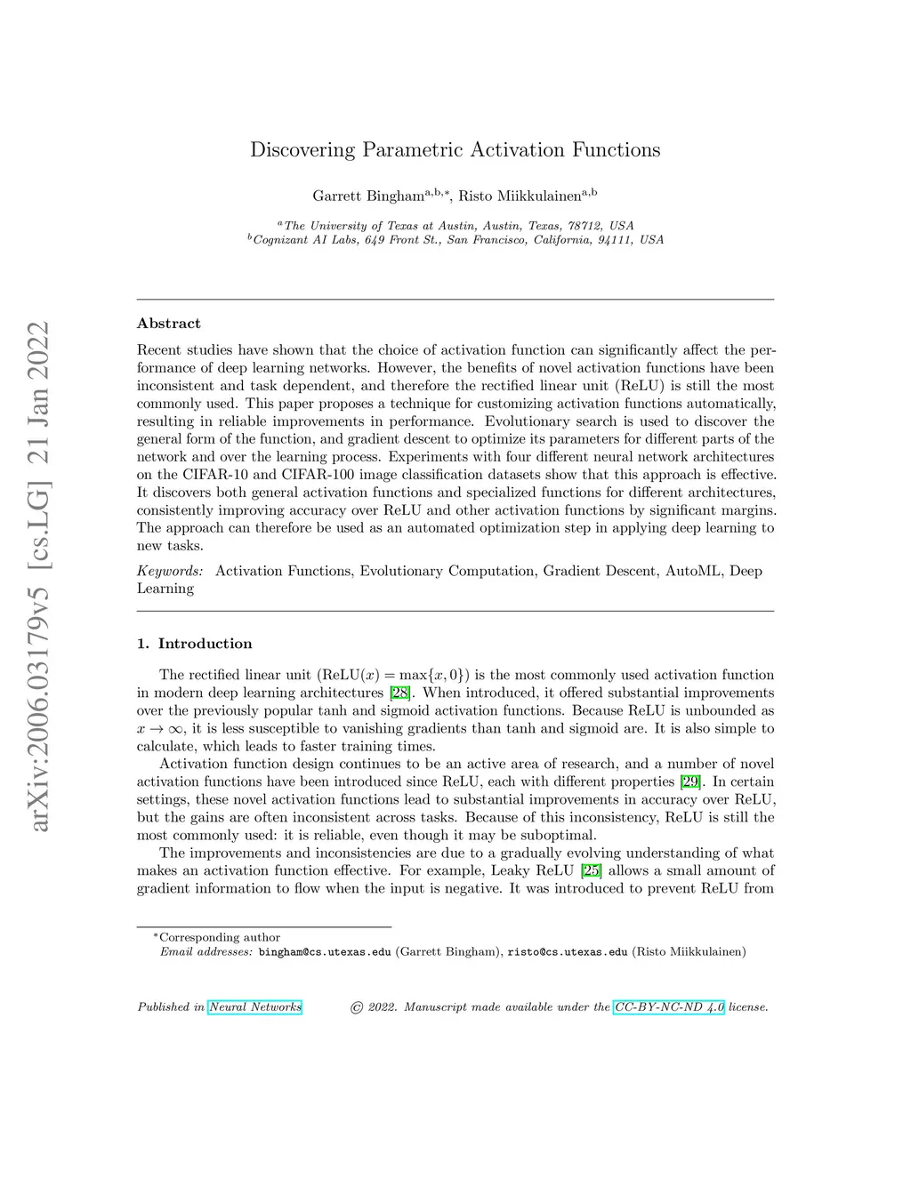 Recent studies have shown that the choice of activation function can significantly affect the performance of deep learning networks. However, the benefits of novel activation functions have been inconsistent and task dependent, and therefore the rectified linear unit (ReLU) is still the most commonly used. This paper proposes a technique for customizing activation functions automatically, resulting in reliable improvements in performance. Evolutionary search is used to discover the general form of the function, and gradient descent to optimize its parameters for different parts of the network and over the learning process. Experiments with four different neural network architectures on the CIFAR-10 and CIFAR-100 image classification datasets show that this approach is effective. It discovers both general activation functions and specialized functions for different architectures, consistently improving accuracy over ReLU and other activation functions by significant margins. The approach can therefore be used as an automated optimization step in applying deep learning to new tasks.