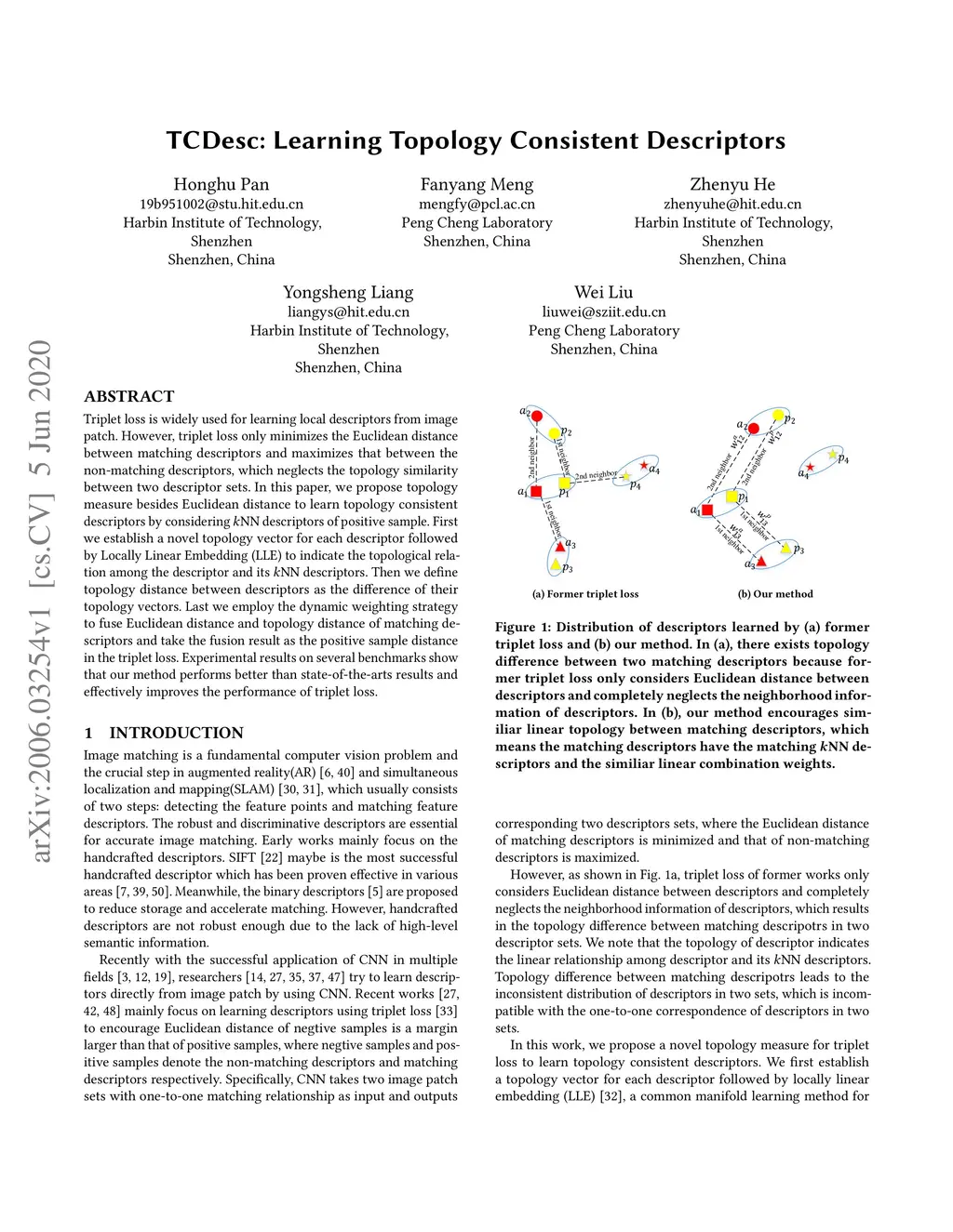 Triplet loss is widely used for learning local descriptors from image patch. However, triplet loss only minimizes the Euclidean distance between matching descriptors and maximizes that between the non-matching descriptors, which neglects the topology similarity between two descriptor sets. In this paper, we propose topology measure besides Euclidean distance to learn topology consistent descriptors by considering kNN descriptors of positive sample. First we establish a novel topology vector for each descriptor followed by Locally Linear Embedding (LLE) to indicate the topological relation among the descriptor and its kNN descriptors. Then we define topology distance between descriptors as the difference of their topology vectors. Last we employ the dynamic weighting strategy to fuse Euclidean distance and topology distance of matching descriptors and take the fusion result as the positive sample distance in the triplet loss. Experimental results on several benchmarks show that our method performs better than state-of-the-arts results and effectively improves the performance of triplet loss.