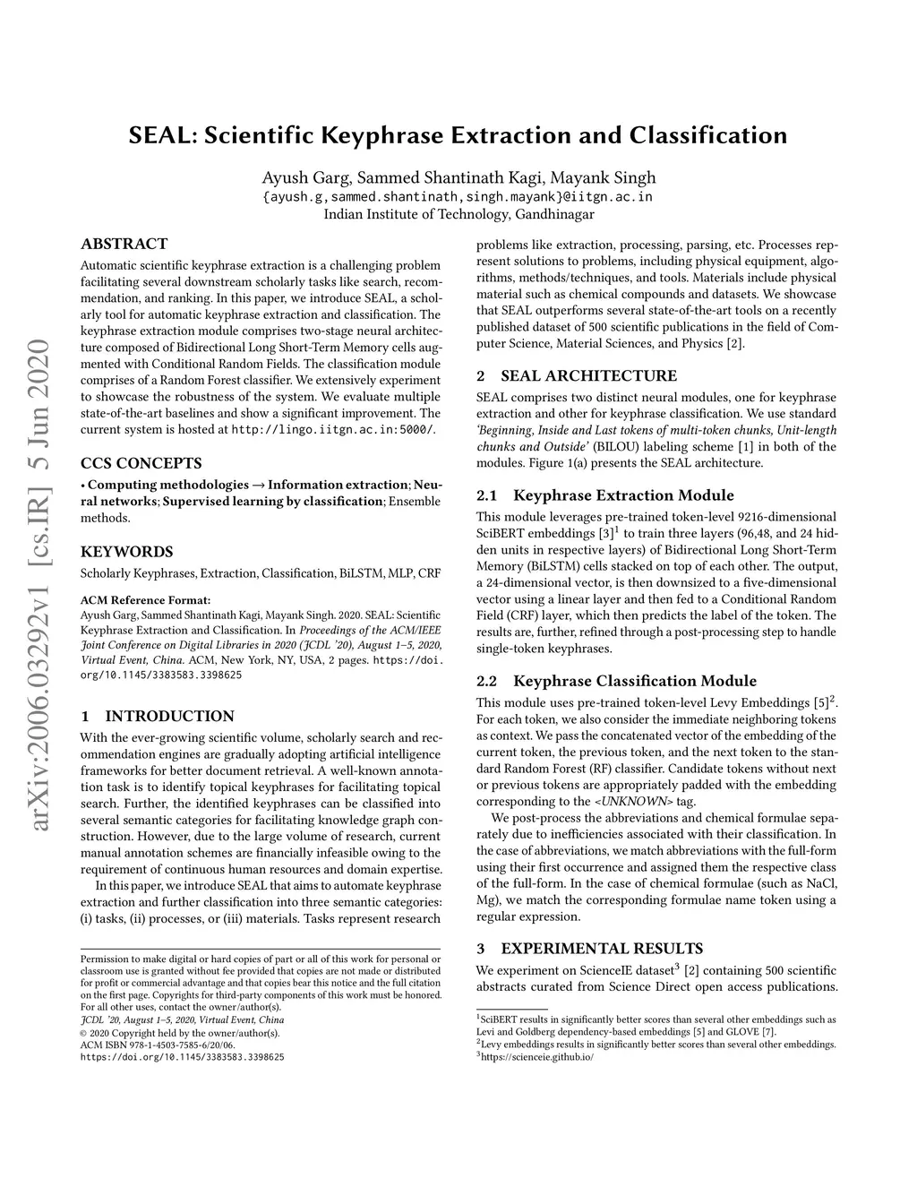 Automatic scientific keyphrase extraction is a challenging problem facilitating several downstream scholarly tasks like search, recommendation, and ranking. In this paper, we introduce SEAL, a scholarly tool for automatic keyphrase extraction and classification. The keyphrase extraction module comprises two-stage neural architecture composed of Bidirectional Long Short-Term Memory cells augmented with Conditional Random Fields. The classification module comprises of a Random Forest classifier. We extensively experiment to showcase the robustness of the system. We evaluate multiple state-of-the-art baselines and show a significant improvement. The current system is hosted at http://lingo.iitgn.ac.in:5000/.