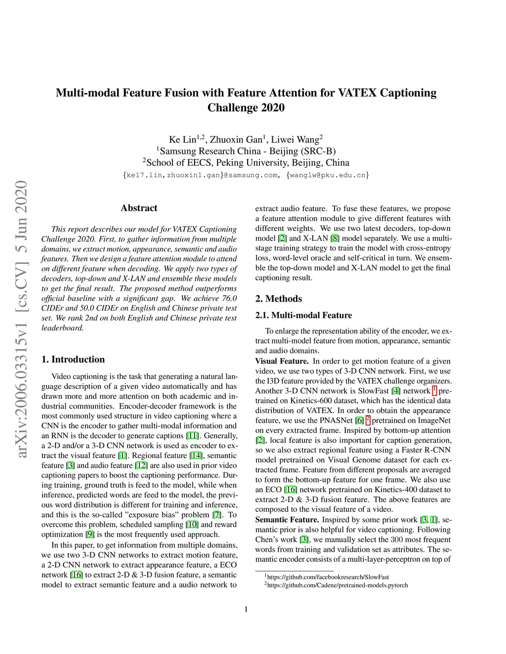 This report describes our model for VATEX Captioning Challenge 2020. First, to gather information from multiple domains, we extract motion, appearance, semantic and audio features. Then we design a feature attention module to attend on different feature when decoding. We apply two types of decoders, top-down and X-LAN and ensemble these models to get the final result. The proposed method outperforms official baseline with a significant gap. We achieve 76.0 CIDEr and 50.0 CIDEr on English and Chinese private test set. We rank 2nd on both English and Chinese private test leaderboard.