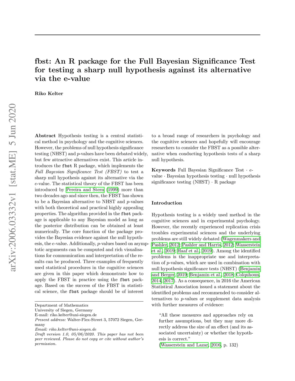 Hypothesis testing is a central statistical method in psychology and the cognitive sciences. However, the problems of null hypothesis significance testing (NHST) and p-values have been debated widely, but few attractive alternatives exist. This article introduces the fbst R package, which implements the Full Bayesian Significance Test (FBST) to test a sharp null hypothesis against its alternative via the e-value. The statistical theory of the FBST has been introduced by Pereira et al. (1999) more than two decades ago and since then, the FBST has shown to be a Bayesian alternative to NHST and p-values with both theoretical and practical highly appealing properties. The algorithm provided in the fbst package is applicable to any Bayesian model as long as the posterior distribution can be obtained at least numerically. The core function of the package provides the Bayesian evidence against the null hypothesis, the e-value. Additionally, p-values based on asymptotic arguments can be computed and rich visualisations for communication and interpretation of the results can be produced. Three examples of frequently used statistical procedures in the cognitive sciences are given in this paper which demonstrate how to apply the FBST in practice using the fbst package. Based on the success of the FBST in statistical science, the fbst package should be of interest to a broad range of researchers in psychology and the cognitive sciences and hopefully will encourage researchers to consider the FBST as a possible alternative when conducting hypothesis tests of a sharp null hypothesis.