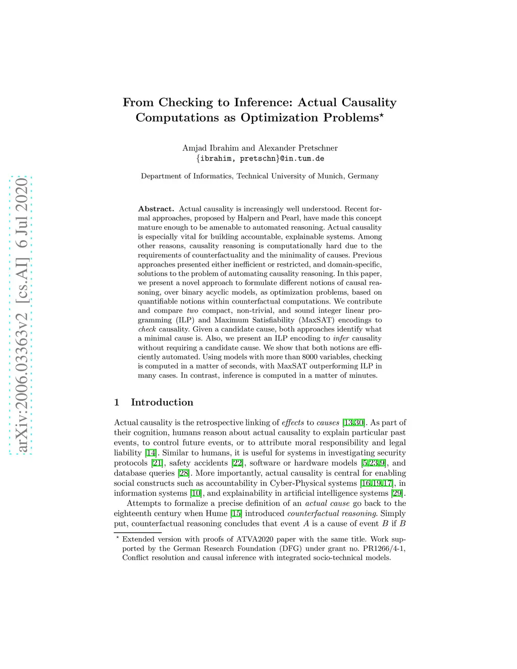 Actual causality is increasingly well understood. Recent formal approaches, proposed by Halpern and Pearl, have made this concept mature enough to be amenable to automated reasoning. Actual causality is especially vital for building accountable, explainable systems. Among other reasons, causality reasoning is computationally hard due to the requirements of counterfactuality and the minimality of causes. Previous approaches presented either inefficient or restricted, and domain-specific, solutions to the problem of automating causality reasoning. In this paper, we present a novel approach to formulate different notions of causal reasoning, over binary acyclic models, as optimization problems, based on quantifiable notions within counterfactual computations. We contribute and compare two compact, non-trivial, and sound integer linear programming (ILP) and Maximum Satisfiability (MaxSAT) encodings to check causality. Given a candidate cause, both approaches identify what a minimal cause is. Also, we present an ILP encoding to infer causality without requiring a candidate cause. We show that both notions are efficiently automated. Using models with more than variables, checking is computed in a matter of seconds, with MaxSAT outperforming ILP in many cases. In contrast, inference is computed in a matter of minutes.
