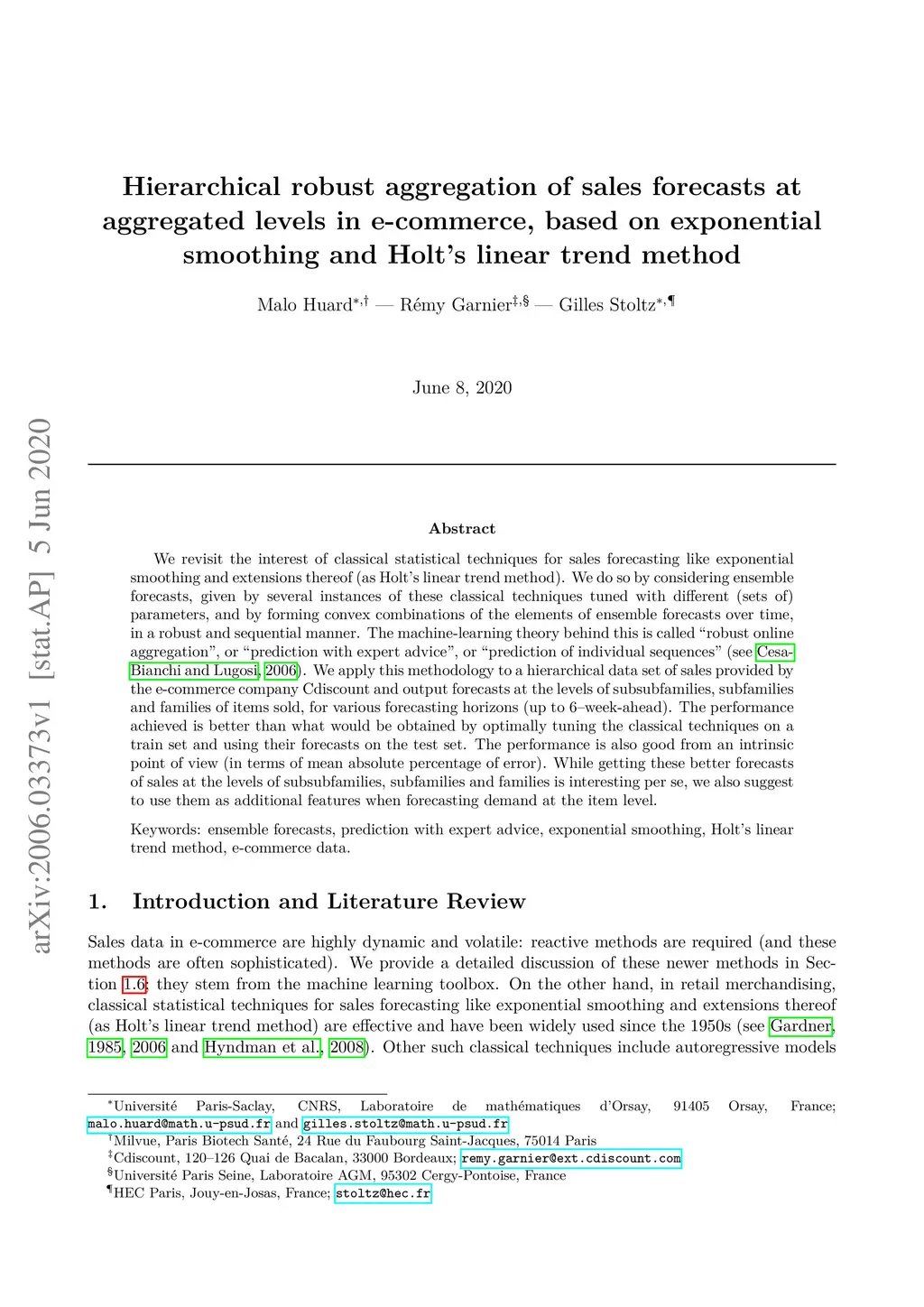 We revisit the interest of classical statistical techniques for sales forecasting like exponential smoothing and extensions thereof (as Holt's linear trend method). We do so by considering ensemble forecasts, given by several instances of these classical techniques tuned with different (sets of) parameters, and by forming convex combinations of the elements of ensemble forecasts over time, in a robust and sequential manner. The machine-learning theory behind this is called "robust online aggregation", or "prediction with expert advice", or "prediction of individual sequences" (see Cesa-Bianchi and Lugosi, 2006). We apply this methodology to a hierarchical data set of sales provided by the e-commerce company Cdiscount and output forecasts at the levels of subsubfamilies, subfamilies and families of items sold, for various forecasting horizons (up to 6-week-ahead). The performance achieved is better than what would be obtained by optimally tuning the classical techniques on a train set and using their forecasts on the test set. The performance is also good from an intrinsic point of view (in terms of mean absolute percentage of error). While getting these better forecasts of sales at the levels of subsubfamilies, subfamilies and families is interesting per se, we also suggest to use them as additional features when forecasting demand at the item level.