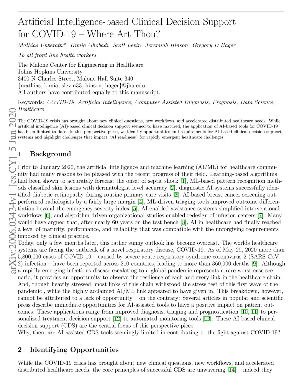 The COVID-19 crisis has brought about new clinical questions, new workflows, and accelerated distributed healthcare needs. While artificial intelligence (AI)-based clinical decision support seemed to have matured, the application of AI-based tools for COVID-19 has been limited to date. In this perspective piece, we identify opportunities and requirements for AI-based clinical decision support systems and highlight challenges that impact "AI readiness" for rapidly emergent healthcare challenges.