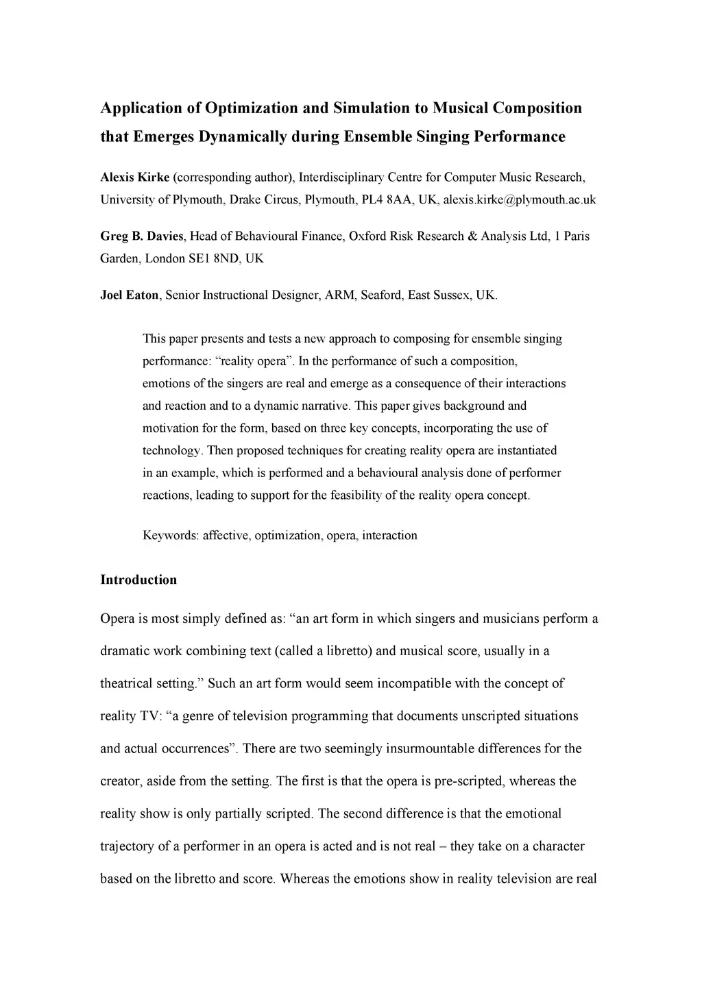 This paper presents and tests a new approach to composing for ensemble singing performance: reality opera. In the performance of such a composition, emotions of the singers are real and emerge as a consequence of their interactions and reaction and to a dynamic narrative. This paper gives background and motivation for the form, based on three key concepts, incorporating the use of technology. Then proposed techniques for creating reality opera are instantiated in an example, which is performed and a behavioral analysis done of performer reactions, leading to support for the feasibility of the reality opera concept.