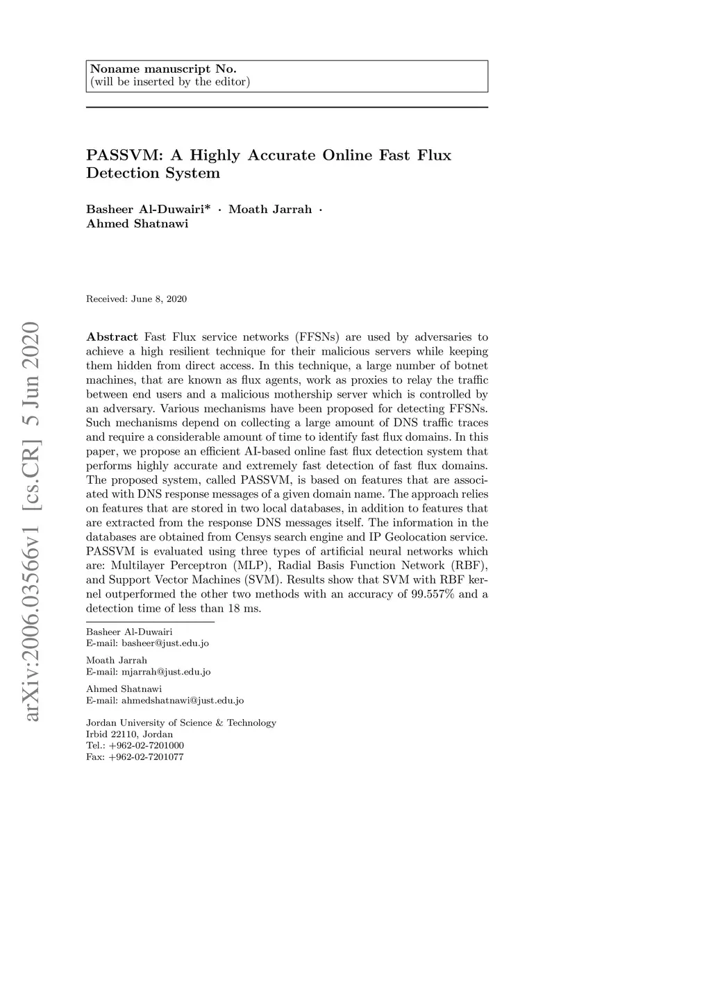 PASSVM: A Highly Accurate Online Fast Flux Detection System