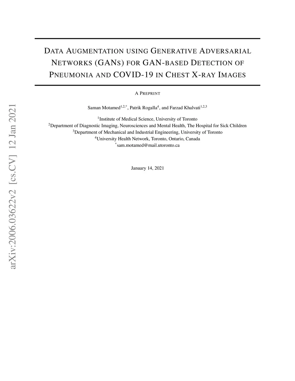 Successful training of convolutional neural networks (CNNs) requires a substantial amount of data. With small datasets networks generalize poorly. Data Augmentation techniques improve the generalizability of neural networks by using existing training data more effectively. Standard data augmentation methods, however, produce limited plausible alternative data. Generative Adversarial Networks (GANs) have been utilized to generate new data and improve the performance of CNNs. Nevertheless, data augmentation techniques for training GANs are under-explored compared to CNNs. In this work, we propose a new GAN architecture for augmentation of chest X-rays for semi-supervised detection of pneumonia and COVID-19 using generative models. We show that the proposed GAN can be used to effectively augment data and improve classification accuracy of disease in chest X-rays for pneumonia and COVID-19. We compare our augmentation GAN model with Deep Convolutional GAN and traditional augmentation methods (rotate, zoom, etc) on two different X-ray datasets and show our GAN-based augmentation method surpasses other augmentation methods for training a GAN in detecting anomalies in X-ray images.