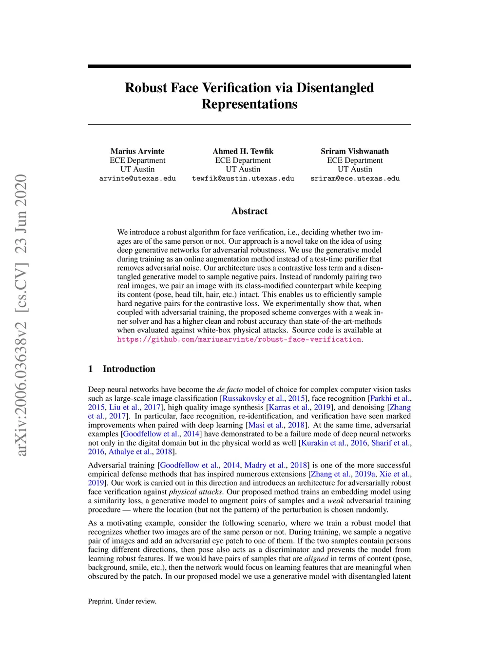 We introduce a robust algorithm for face verification, i.e., deciding whether twoimages are of the same person or not. Our approach is a novel take on the idea ofusing deep generative networks for adversarial robustness. We use the generativemodel during training as an online augmentation method instead of a test-timepurifier that removes adversarial noise. Our architecture uses a contrastive loss termand a disentangled generative model to sample negative pairs. Instead of randomlypairing two real images, we pair an image with its class-modified counterpart whilekeeping its content (pose, head tilt, hair, etc.) intact. This enables us to efficientlysample hard negative pairs for the contrastive loss. We experimentally show that, when coupled with adversarial training, the proposed scheme converges with aweak inner solver and has a higher clean and robust accuracy than state-of-the-art-methods when evaluated against white-box physical attacks.