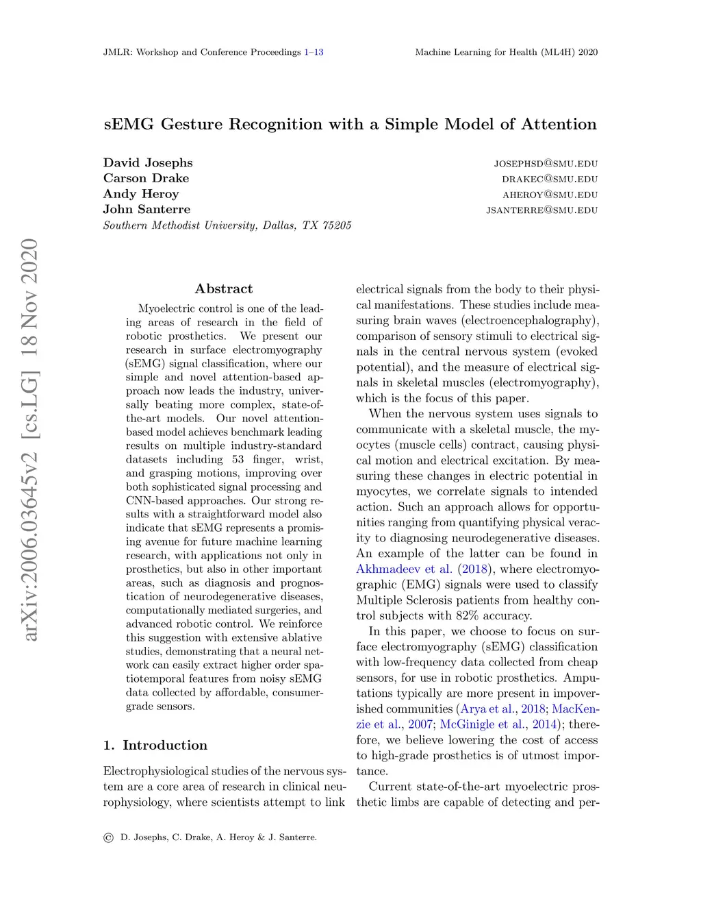 Myoelectric control is one of the leading areas of research in the field of robotic prosthetics. We present our research in surface electromyography (sEMG) signal classification, where our simple and novel attention-based approach now leads the industry, universally beating more complex, state-of-the-art models. Our novel attention-based model achieves benchmark leading results on multiple industry-standard datasets including 53 finger, wrist, and grasping motions, improving over both sophisticated signal processing and CNN-based approaches. Our strong results with a straightforward model also indicate that sEMG represents a promising avenue for future machine learning research, with applications not only in prosthetics, but also in other important areas, such as diagnosis and prognostication of neurodegenerative diseases, computationally mediated surgeries, and advanced robotic control. We reinforce this suggestion with extensive ablative studies, demonstrating that a neural network can easily extract higher order spatiotemporal features from noisy sEMG data collected by affordable, consumer-grade sensors.