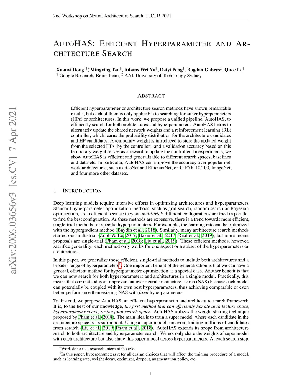 Efficient hyperparameter or architecture search methods have shown remarkable results, but each of them is only applicable to searching for either hyperparameters (HPs) or architectures. In this work, we propose a unified pipeline, AutoHAS, to efficiently search for both architectures and hyperparameters. AutoHAS learns to alternately update the shared network weights and a reinforcement learning (RL) controller, which learns the probability distribution for the architecture candidates and HP candidates. A temporary weight is introduced to store the updated weight from the selected HPs (by the controller), and a validation accuracy based on this temporary weight serves as a reward to update the controller. In experiments, we show AutoHAS is efficient and generalizable to different search spaces, baselines and datasets. In particular, AutoHAS can improve the accuracy over popular network architectures, such as ResNet and EfficientNet, on CIFAR-10/100, ImageNet, and four more other datasets.