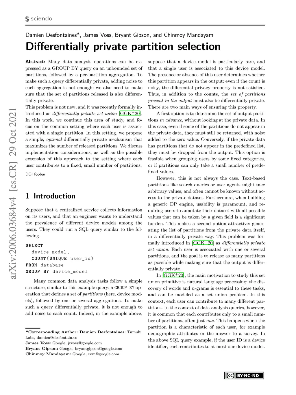 Many data analysis operations can be expressed as a GROUP BY query on an unbounded set of partitions, followed by a per-partition aggregation. To make such a query differentially private, adding noise to each aggregation is not enough: we also need to make sure that the set of partitions released is also differentially private. This problem is not new, and it was recently formally introduced as differentially private set union. In this work, we continue this area of study, and focus on the common setting where each user is associated with a single partition. In this setting, we propose a simple, optimal differentially private mechanism that maximizes the number of released partitions. We discuss implementation considerations, as well as the possible extension of this approach to the setting where each user contributes to a fixed, small number of partitions.