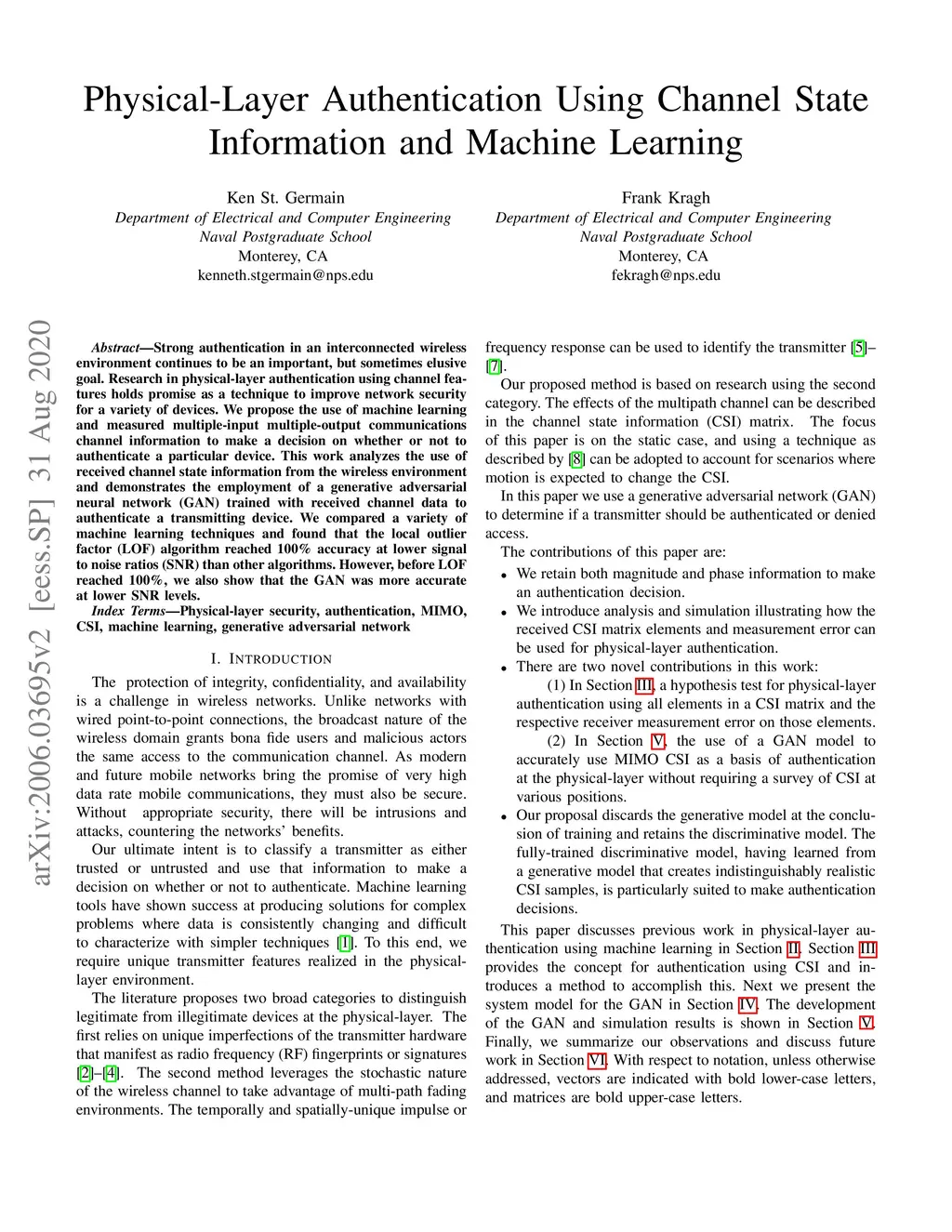 Strong authentication in an interconnected wireless environment continues to be an important, but sometimes elusive goal. Research in physical-layer authentication using channel features holds promise as a technique to improve network security for a variety of devices. We propose the use of machine learning and measured multiple-input multiple-output communications channel information to make a decision on whether or not to authenticate a particular device. This work analyzes the use of received channel state information from the wireless environment and demonstrates the employment of a generative adversarial neural network (GAN) trained with received channel data to authenticate a transmitting device. We compared a variety of machine learning techniques and found that the local outlier factor (LOF) algorithm reached 100% accuracy at lower signal to noise ratios (SNR) than other algorithms. However, before LOF reached 100%, we also show that the GAN was more accurate at lower SNR levels.