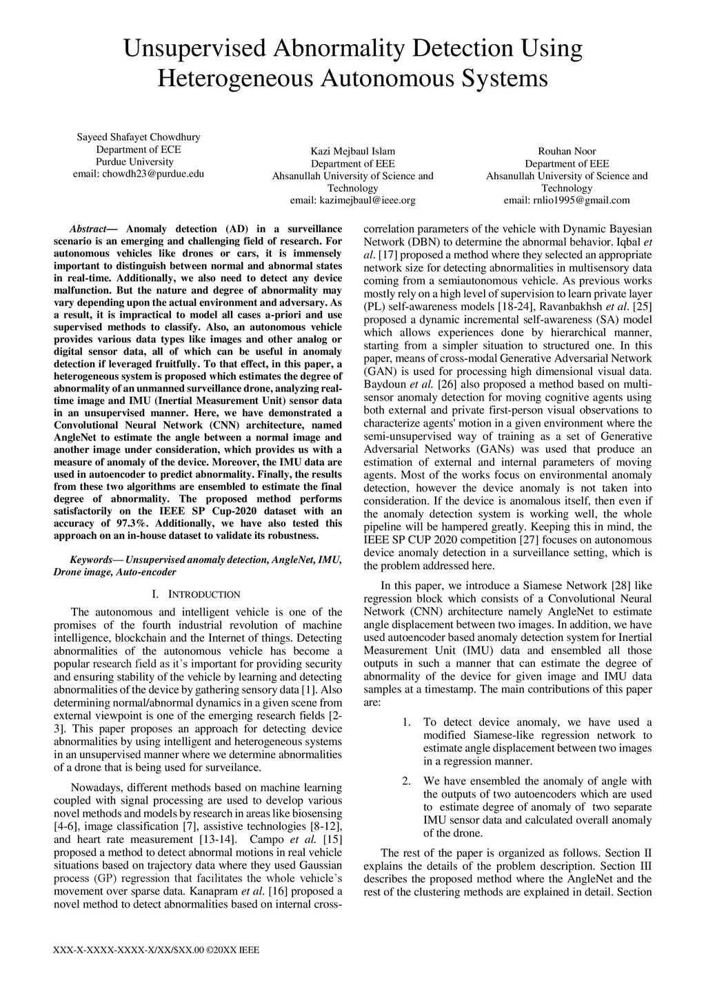 Anomaly detection (AD) in a surveillance scenario is an emerging and challenging field of research. For autonomous vehicles like drones or cars, it is immensely important to distinguish between normal and abnormal states in real-time. Additionally, we also need to detect any device malfunction. But the nature and degree of abnormality may vary depending upon the actual environment and adversary. As a result, it is impractical to model all cases a-priori and use supervised methods to classify. Also, an autonomous vehicle provides various data types like images and other analog or digital sensor data, all of which can be useful in anomaly detection if leveraged fruitfully. To that effect, in this paper, a heterogeneous system is proposed which estimates the degree of abnormality of an unmanned surveillance drone, analyzing real-time image and IMU (Inertial Measurement Unit) sensor data in an unsupervised manner. Here, we have demonstrated a Convolutional Neural Network (CNN) architecture, named AngleNet to estimate the angle between a normal image and another image under consideration, which provides us with a measure of anomaly of the device. Moreover, the IMU data are used in autoencoder to predict abnormality. Finally, the results from these two algorithms are ensembled to estimate the final degree of abnormality. The proposed method performs satisfactorily on the IEEE SP Cup-2020 dataset with an accuracy of 97.3%. Additionally, we have also tested this approach on an in-house dataset to validate its robustness.
